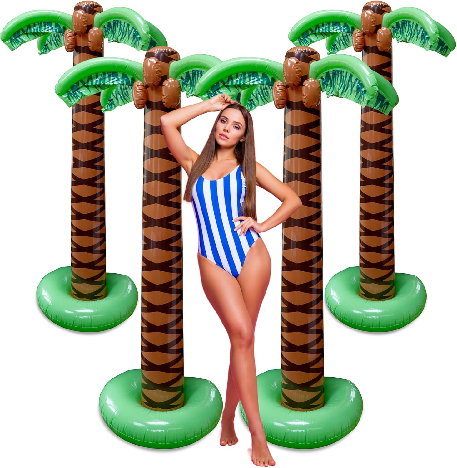 Playbees Giant Inflatable Palm Tree 6 Foot - 4PK - Beach Party Decorations for Summer Luau Themed Pool Party, Tropical Hawaiian Blow Up Palm Tree Favors - Poolside Ambiance, Easy Inflation