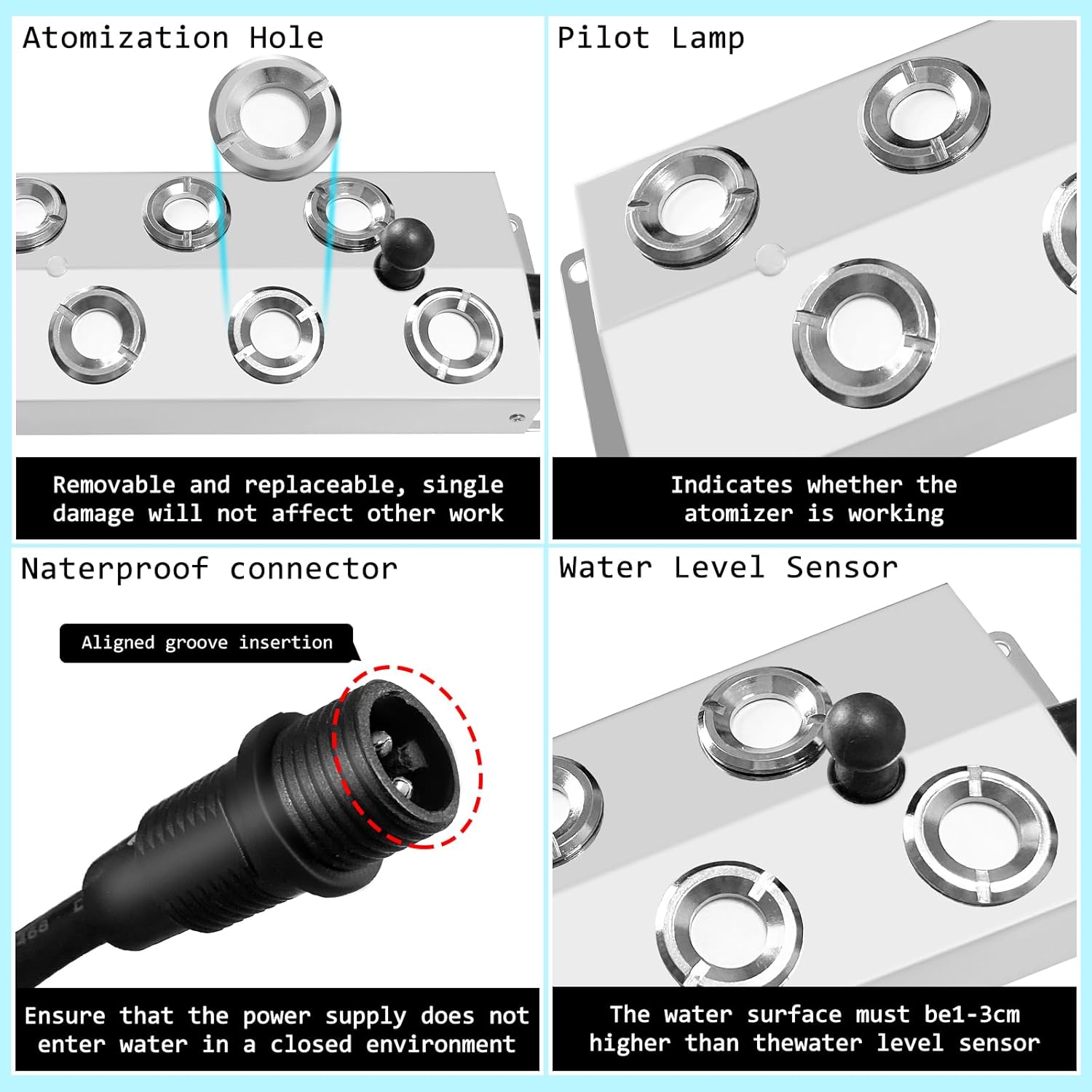 【Características de Flotación y Protección】Los flotadores incluidos ayudan a mantener los niveles adecuados de agua, mientras que el generador de niebla está equipado con funciones de protección contra falta de agua y alta temperatura. Si la superficie del agua está por debajo del sensor de nivel de agua o la temperatura está por encima de 55℃ (el rango de temperatura de trabajo del agua: 5℃-55℃), el poder se apagará automáticamente.