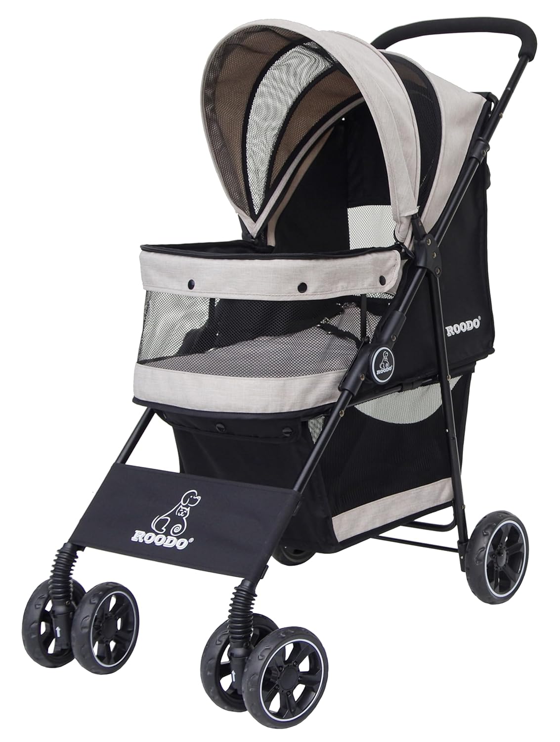 ROODO multifunctional 4wheel pet stroller is smooth and easy to use. The pet rest area is covered with multi-directional breathable nets to enjoy the fresh air and protect your pets from insects. Equipped with a storage basket for easy storage of items. The pet stroller can be folded easily and compactly enough to fit into the trunk of the car. It is a great choice to bring your pet, walk, jog, travel and enjoy the outdoors together.