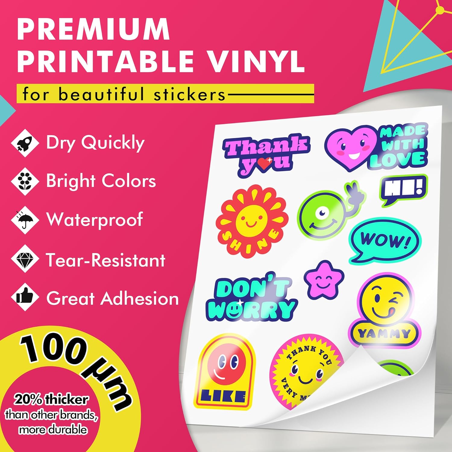 Waterproof & Durable: Crafted from premium vinyl material, our sticker paper is water-resistant and ensures durability in various conditions. For full waterproofness and extended lifespan, apply laminate sheets or a sealer spray after printing.