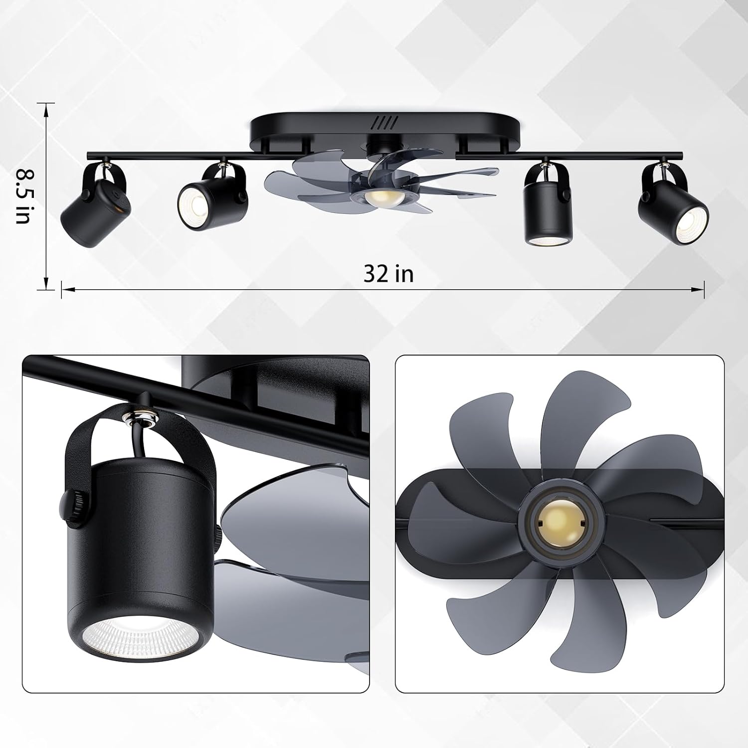 PAZALA 32IN Track Light Ceiling Fan Combo - Black Ceiling Fan with Adjustable LED Track Lighting for Living Room, Kitchen