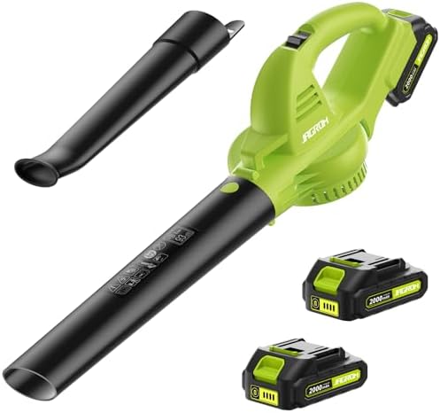 [2 Batteries for Long Working Time] JAGROM cordless leaf blower packs with two 2.0Ah batteries and charger. You can totally get more than 30 minutes operating time with them. When one battery is charging, another one can be charged, you will not need to worry about running out of the power. Meet different kinds of the cleaning job needs.