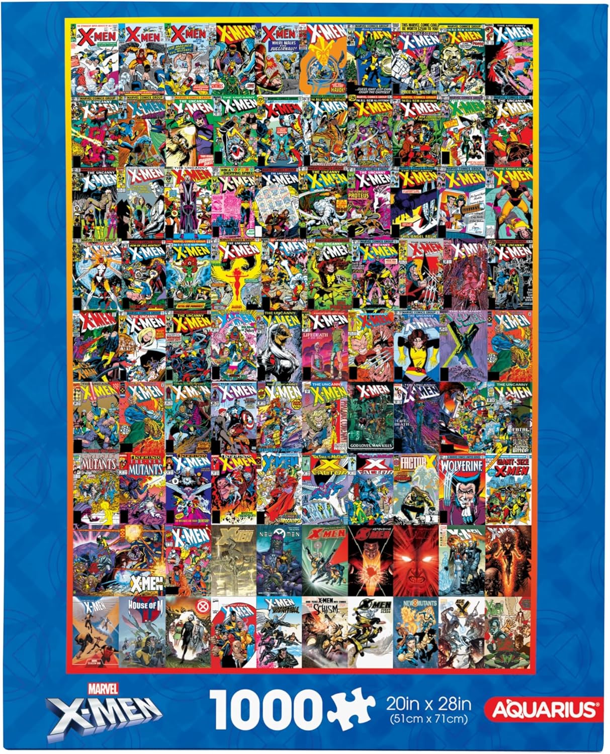 MARVEL X-MEN 1000 PIECE JIGSAW PUZZLE: Enjoy piecing together this 1000 piece puzzle featuring 90 of X-Men's most iconic comic covers. It measure 20 x 28 when completed and fits in a standard size frame. LOOKING FOR MARVEL X-MEN GIFTS? This X-Men puzzle is the ultimate gift for his fans eveywhere. Perfect for family puzzling, game night, birthdays, Holidays, tweens, kidults and adults will absolutely love receiving it. PREMIUM QUALITY YOU CAN TRUST: Our precision cutting technique ensures a perfect fit of all puzzle pieces, leaving virtually no puzzle dust behind. We use thick quality paper that is glare-free so you can show off your masterpiece with pride. 100% OFFICIALLY LICENSED MARVEL X-MEN MERCHANDISE: All our Marvel Puzzles are designed by AQUARIUS, officially licensed, and 100% authentic. They're the perfect piece of X-Men collectible memorabilia to add to your collection.