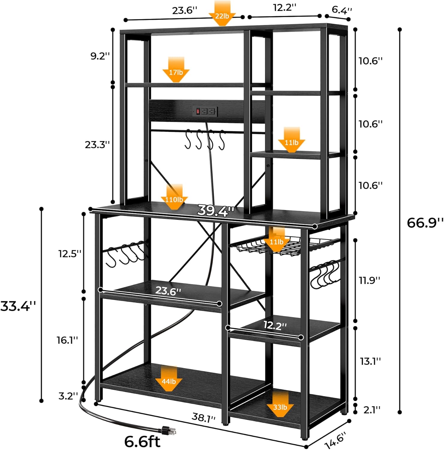 SUPERJARE Large Bakers Rack with Power Outlets, 6-Tier Microwave Stand, Coffee Bar with 12 S-Shaped Hooks, Kitchen Shelf with Wire Basket, 39.4 x 14.6 x 66.9 Inches, Black