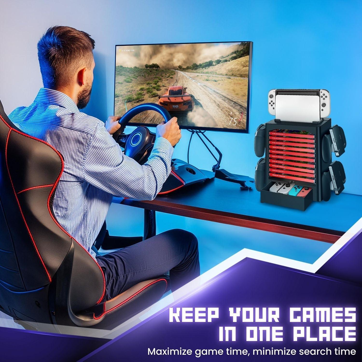 Space Saving Vertical Storage For Nintendo Switch - Organize and display your collection of game cases, pro controllers, joy-con grips, accessories, and Switch dock. Compact space saving design that displays your favorite console with easy access to accessories