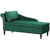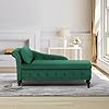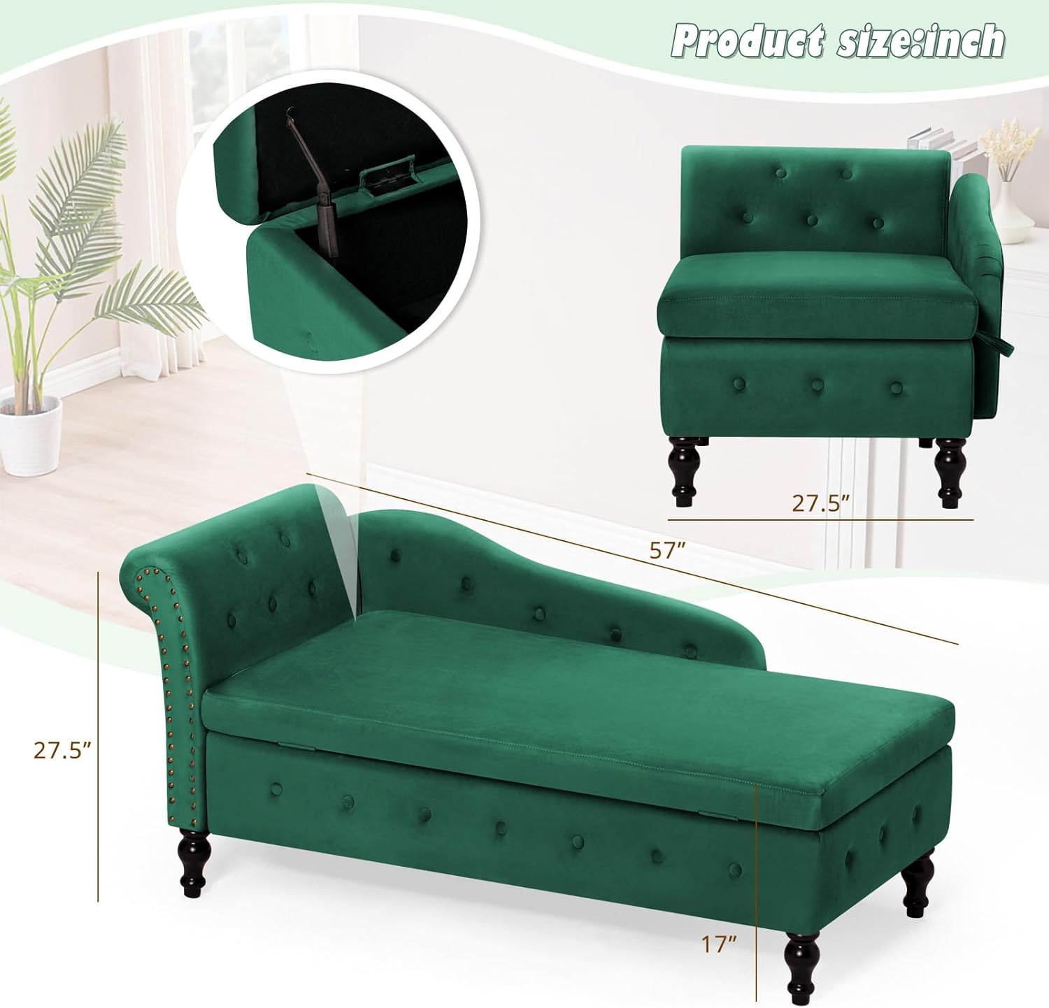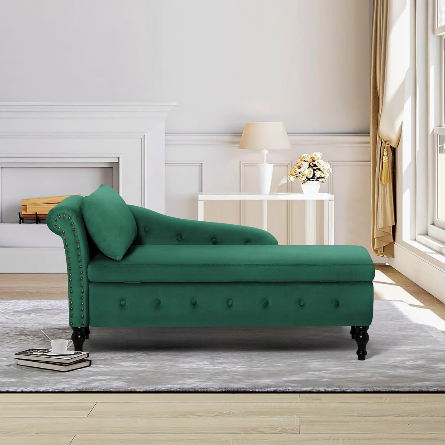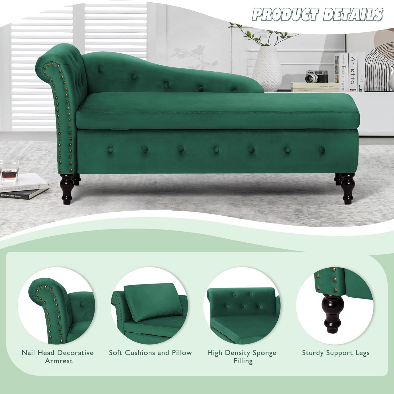 Upholstered Chaise Lounge with Left Armrest & Lumbar Pillow,Button Tufted Lounge Sofa with Storage,Lounge Chair Indoor,Modern Velvet Lounge Chair for Bedroom, Living Room and Office,Green