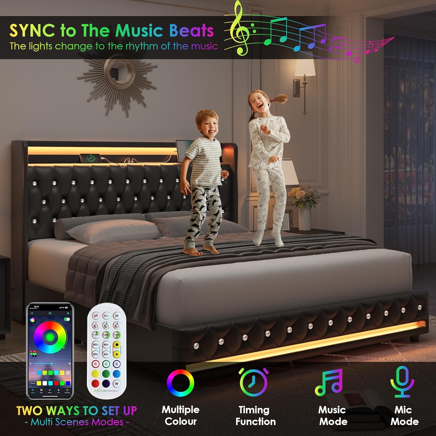 HIFIT Queen LED Bed Frame with Charging Station and 4 Storage Drawers, PU Upholstered Platform Bed with Handcrafted Crystal Button Wingback Headboard, Metal Frame with No Box Spring Needed, Black