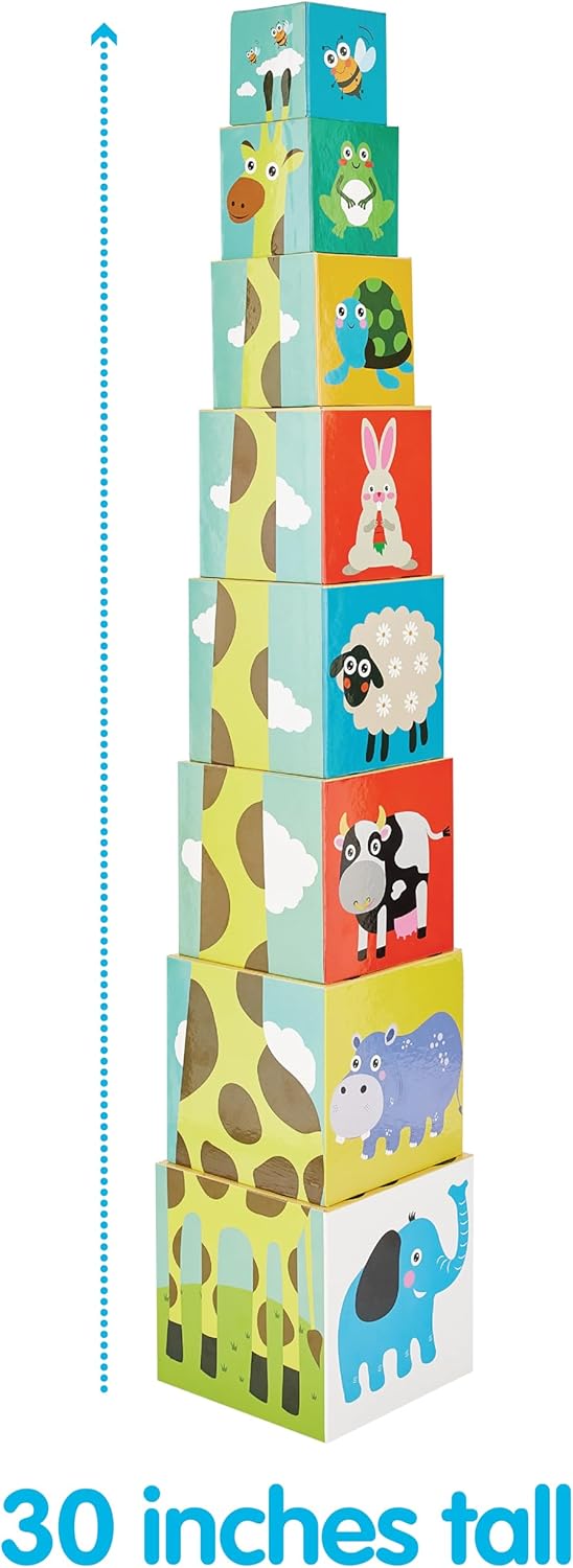 A TOWERING ALPHABET ADVENTURE: Nest and stack 8 vibrant cardboard blocks (each boasting 5 sides of learning!), featuring both uppercase and lowercase letters of the entire alphabet (A-Z). Master letter recognition in both upper & lower case!