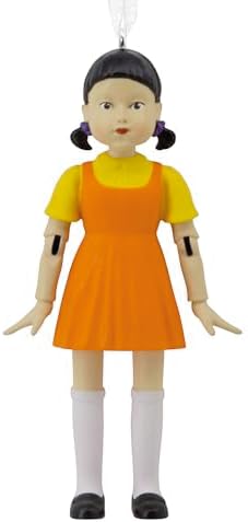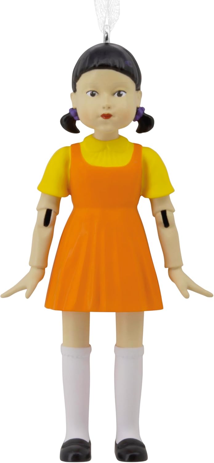 Hang this Young-hee Christmas tree ornament on your tree—if you dare! Fans of the popular Netflix series "Squid Game" will appreciate the eerie design featuring the oversized and deadly motion-sensing animatronic doll unassumingly dressed in a yellow blouse and orange jumper. Hallmark Ornaments are a great way to commemorate hobbies, life events and individual interests in entertainment, sports and more. Each festive and collectible ornament is perfect for sharing with family and friends.