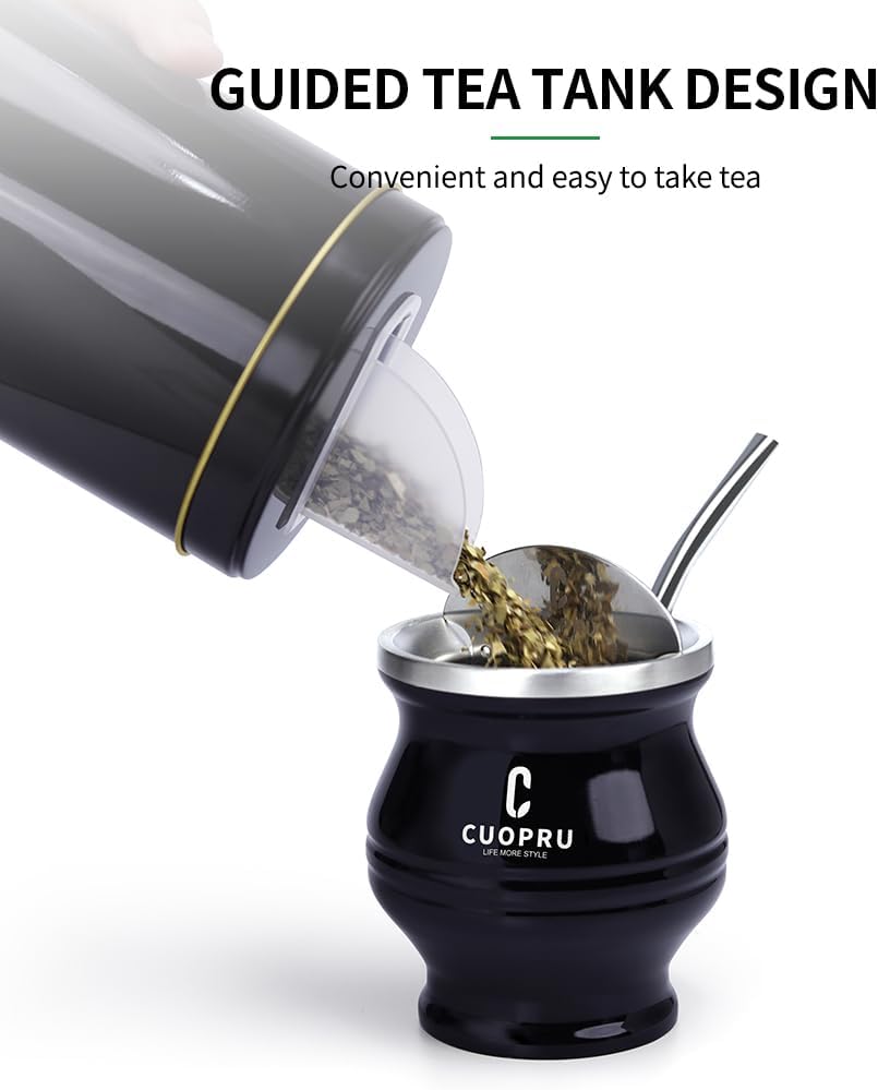 Mate Prep Made Easy: CUOPRU Portable yerba tea caddy enhances the convenience of everyday mate preparation. Easy-to-open and leak-proof with a mate spout for easy serving.