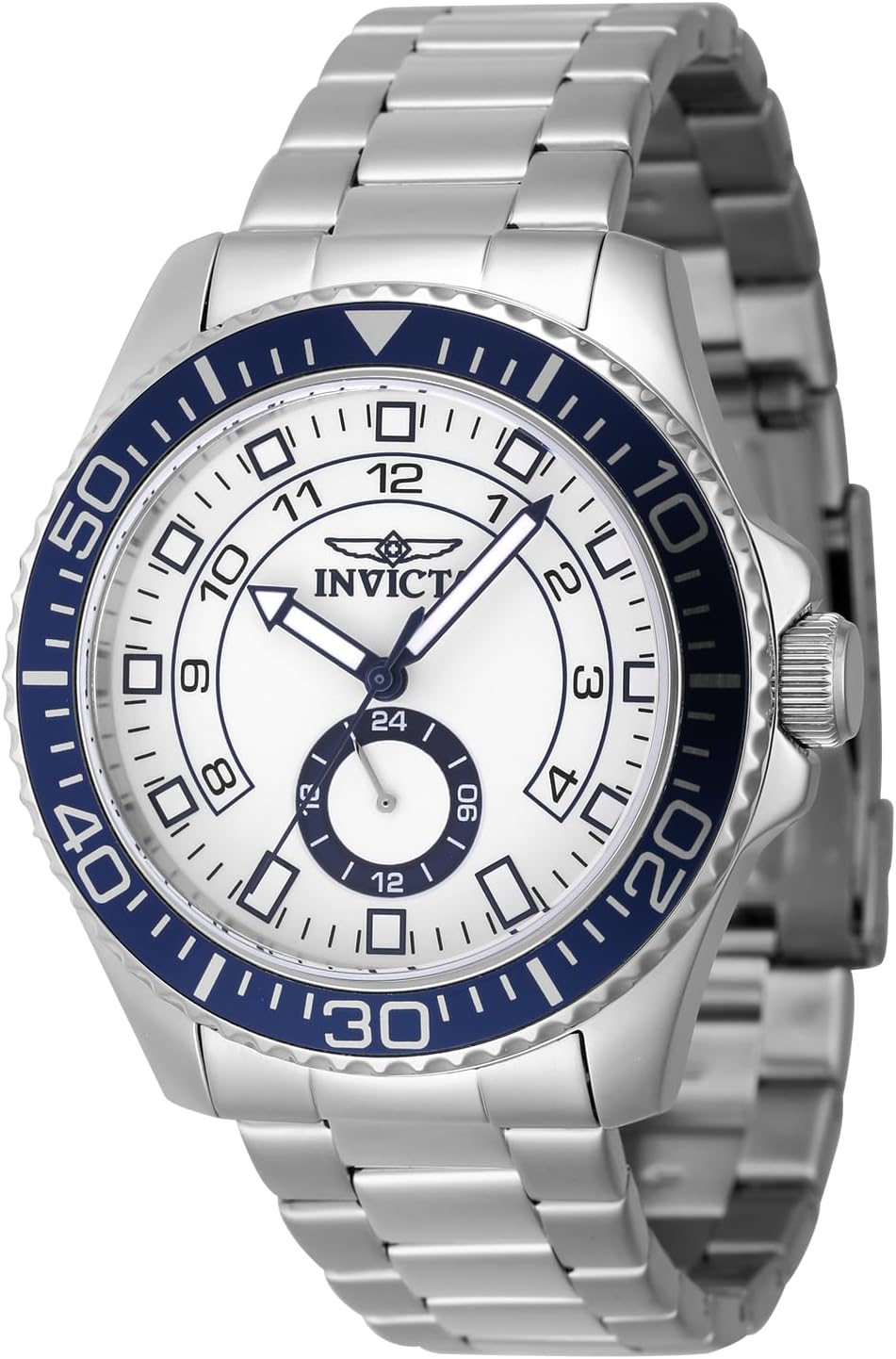 White dial enhanced by silver-tone hands. Silver-tone stainless steel case with a silver-tone stainless steel band. Quartz movement. 50 meters / 165 feet water resistance. Uni-directional Rotating bezel. Flame Fusion crystal. Solid caseback. Fold Over with Safety Release clasp. Pull / Push crown. Case size 44 mm x 11.00 mm. Band 22 mm x 7.25 incheslong. Invicta 47124 Pro Diver Watch.