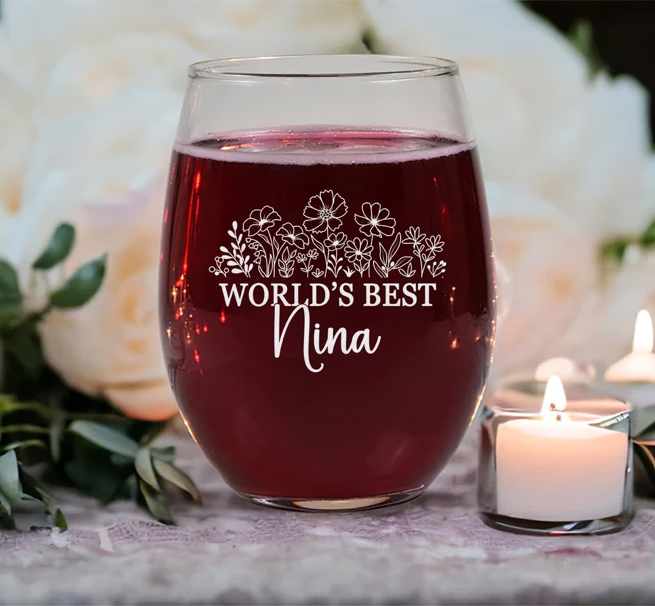 World's Best Nina Wine Glass - Gifts For Nina From Grandkids - Birthday Gifts For Nina - Mother's Day Gifts - Nina Wildflowers Wine Glass - Best Nina Floral Wine Glass