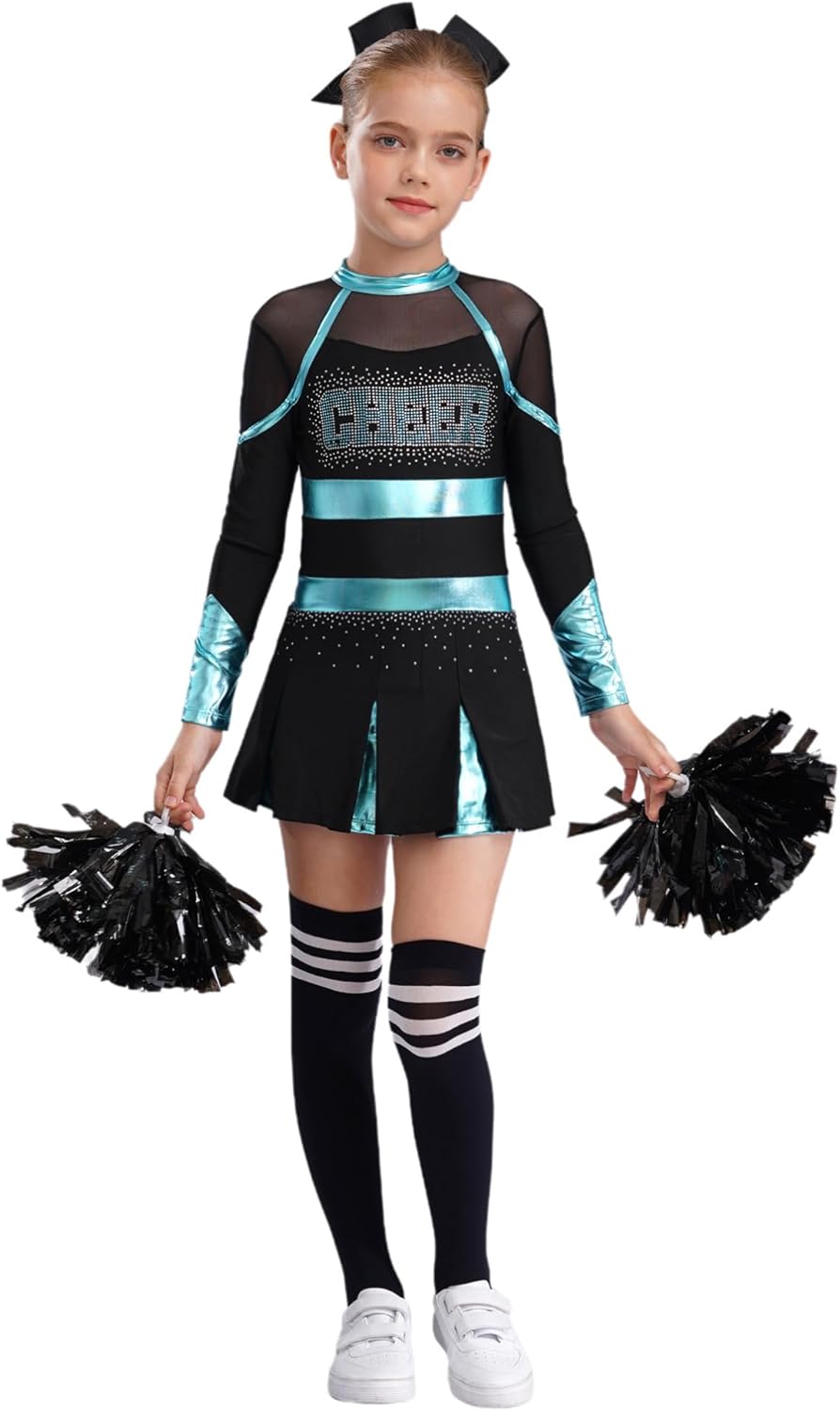 TiaoBug Girls Halloween Party Cheer Leader Outfits Long Sleeve Cheerleading Dance Dress and Headwear Pom Pom Socks