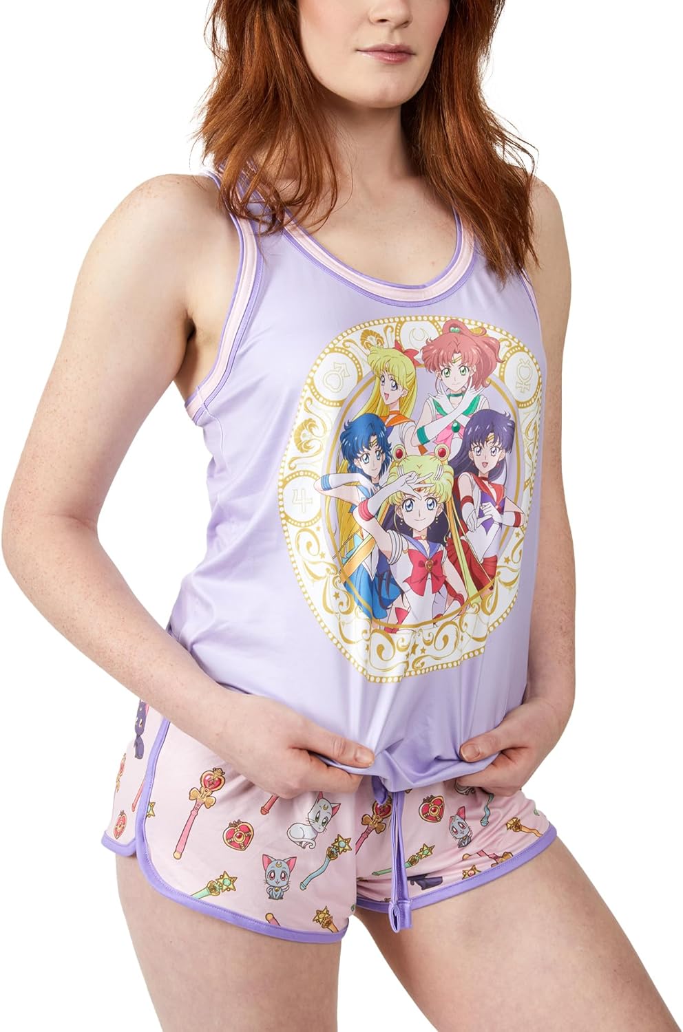 Transform your nights with this women's Sailor Moon racer tank and dolphin shorts sleep set. The purple sleeveless tank, with pink trim, features a delightful group shot of Sailor Moon, Sailor Mercury, Sailor Venus, Sailor Jupiter, and Sailor Mars. Paired with pink shorts showcasing an all-over print of cats and wands, this officially licensed set is made from 92% polyester and 8% spandex brush jersey for a dreamy blend of comfort and style. Machine wash this set on cold, tumble dry on low heat, and cool iron when needed. Elevate your sleepwear with this custom-designed, high-quality Sailor Moon set.