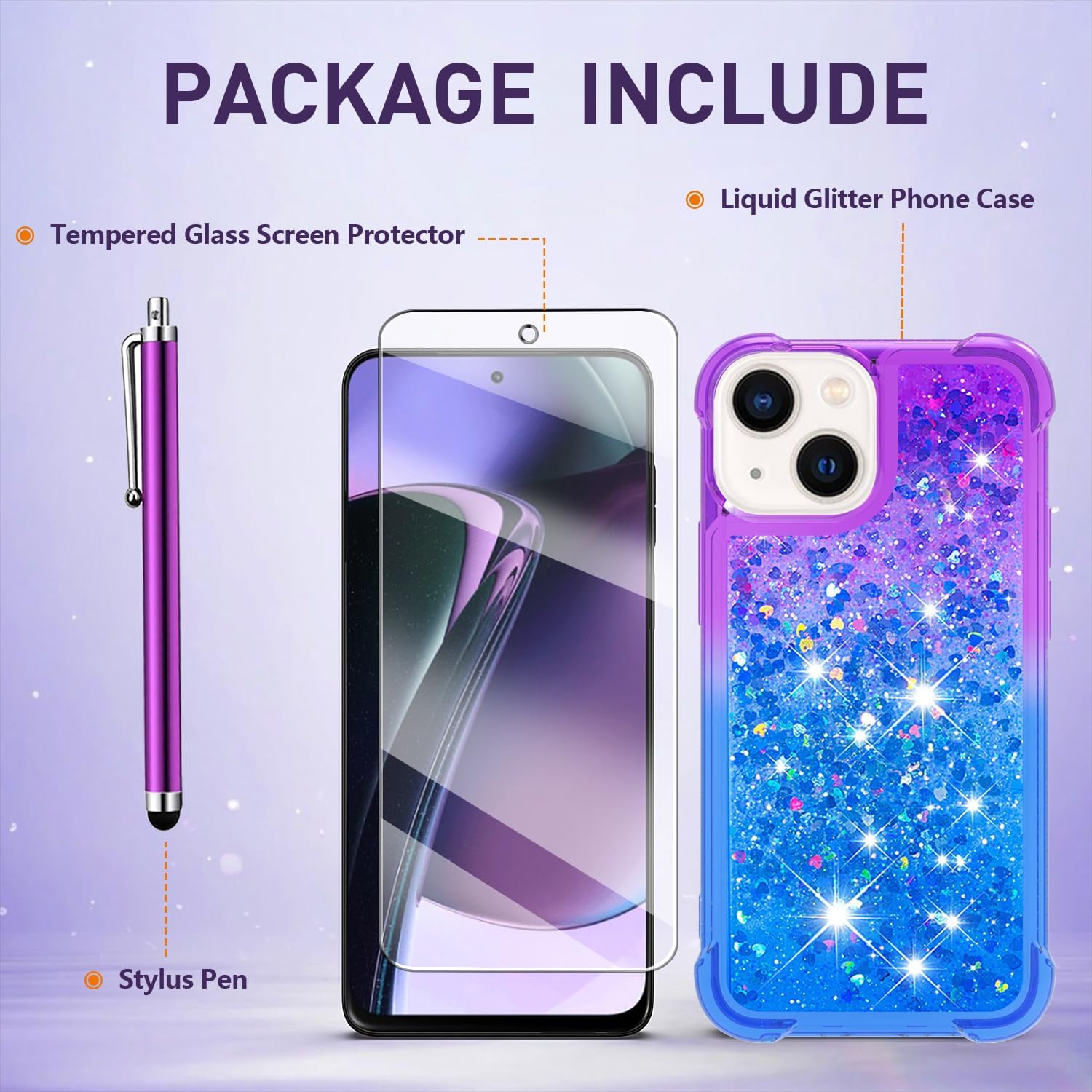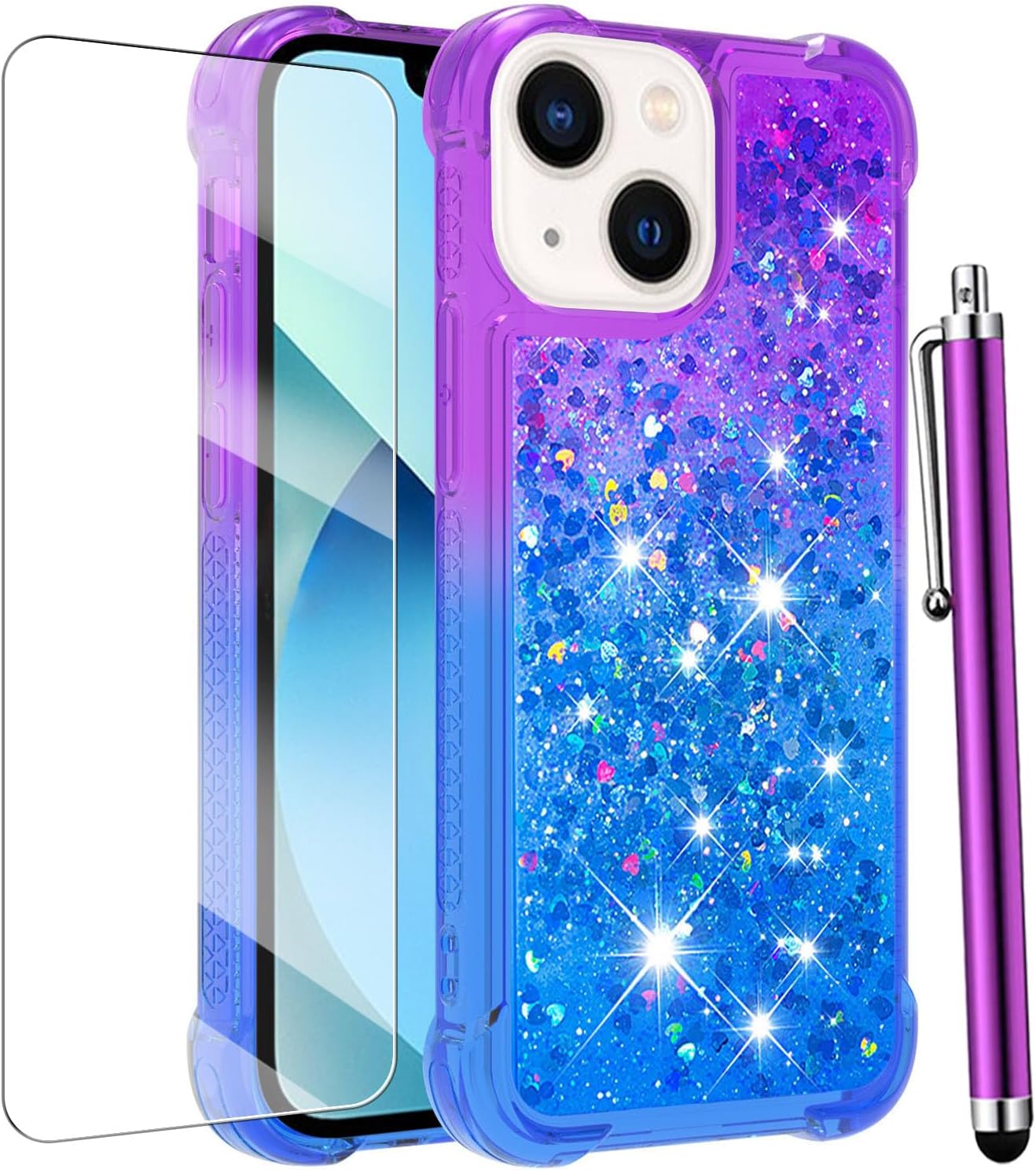 CAIYUNL ONLY for iPhone 14/iPhone 13 with Tempered Glass Screen Protector - Glitter Bling Floating Liquid Cute Women Girls Soft TPU Shockproof Phone CaseBling Bling StyleSparkly glitter bling design with liquid quicksand. Glitter moving star in the back clear case, shining in the sunlight with fashion color, very cute and beautiful. Premium MaterialPremium and soft TPU material, bendable and Anti-slip silicone bumper with enhanced Corner impact absorption. Perfect for everyday use and sturdy enough to protect your phone from bumps, scratches and drops. Shock Absorption, Scratch Resistant. Leak-Worry-Free DesignThe liquid is white mineral oil, SGS passed which is harmless to our skin.Package Include:1 * Case for iPhone 14/iPhone 131 * Tempered Glass Screen Protector1 * Stylus PenQ&A About Our Glitter CaseQ1: Is this phone case compatible with iPhone 14/iPhone 13 Phone?A: Yes, the case is compatible with for iPhone 14 and for iPhone 13.Q2: Does it also come with a screen protector?A: Yes, the Package included a 9H tempered glass screen protector.Q3: Will the glitter stay inside?A: Yes, the inside glitters floats freely but will never leak.Q4: How protective is this glitter case? A: Reinforced rubber corners aborb impacts provide protection from drops and cracks, and the enough raised lip protect the front screen and the back camera.