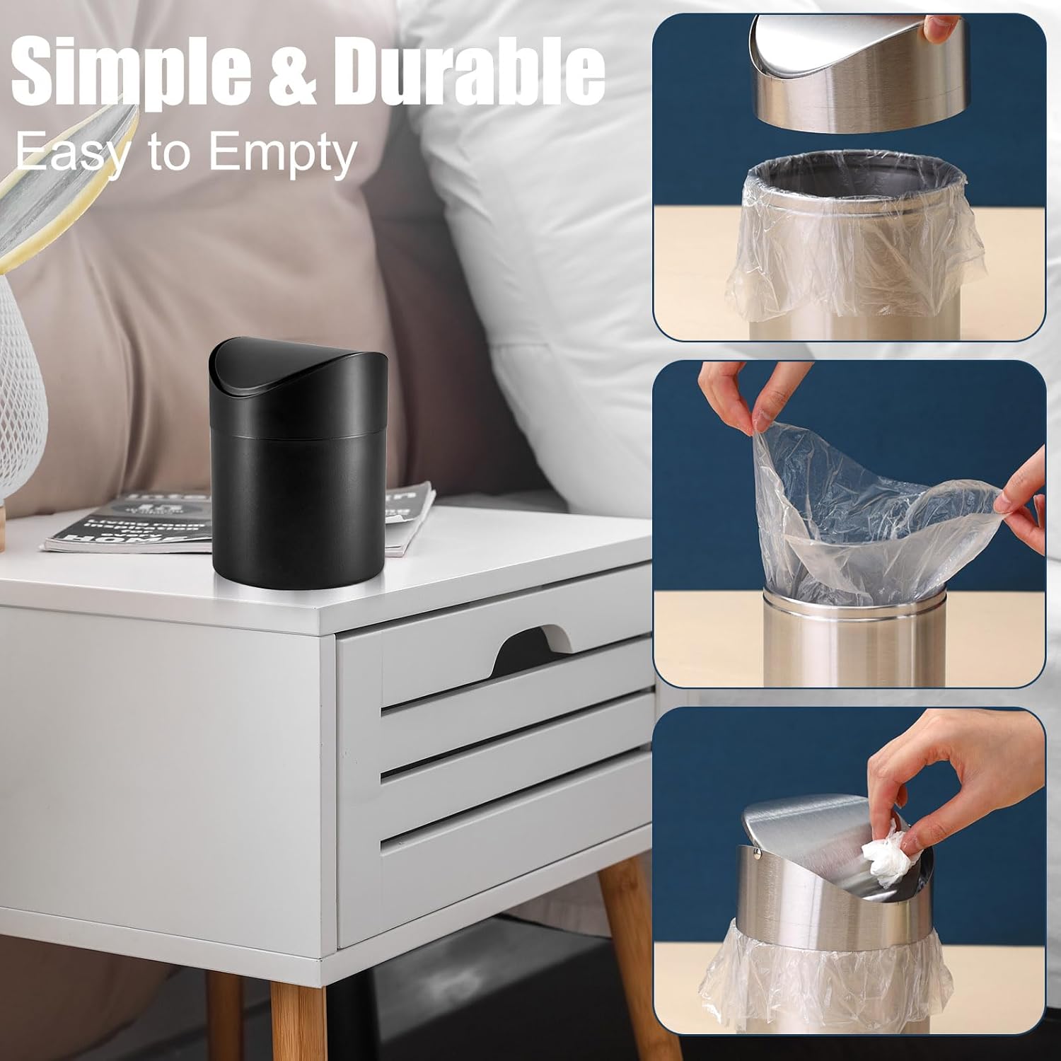 Versatile Usage: office areas, bathrooms, cabinets, vanities, tables, countertops, coffee shops, or cars, you name it, and this small wastebasket with lid can fit in; Our small bins with lids are suitable for handling small scrap items like paper towels, coffee grounds, makeup sponges, beauty supplies, tissues, and more; Clean up requires just a quick wipe with a wet paper towel or napkin, saving you time and effort