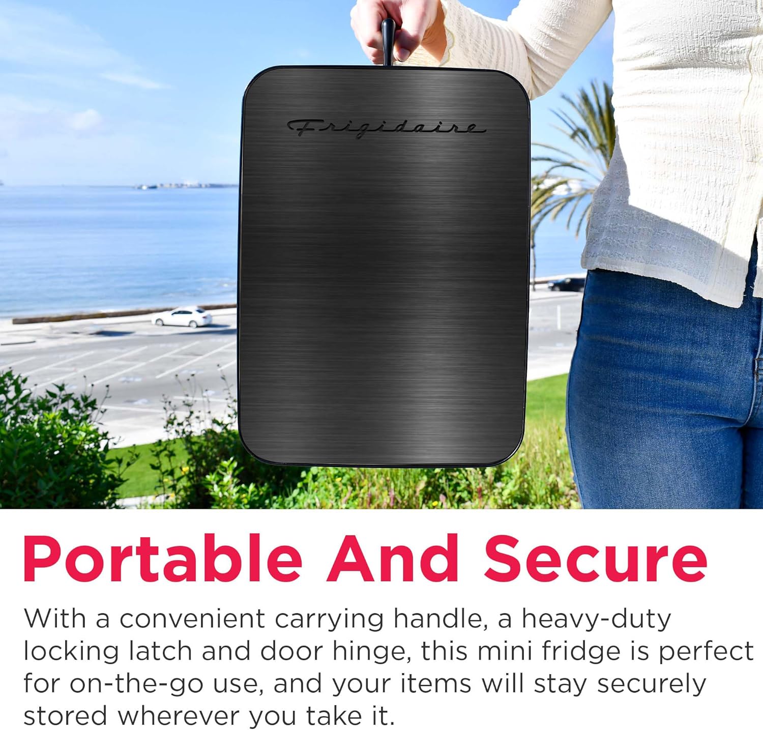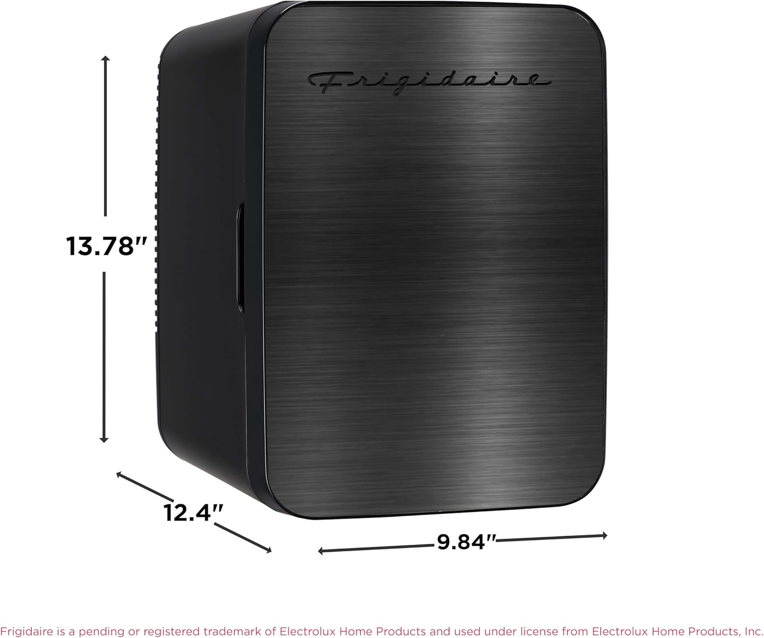 Frigidaire Mini Personal Fridge Cooler, Countertop, Holds Up to 10L/15 Cans, Brushed Black Stainless Rugged Design, Portable for Skincare, Makeup, Car, Office, Bedroom, Dorm Room, or Cabin