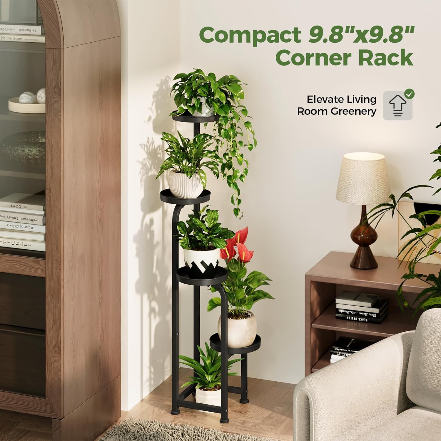 Compact Size: Standing at 46 in tall and 8.8 in wide at the base, this corner plant stand fits perfectly in tight spaces; enhances any living space with its sleek design; a great addition for a plant stand indoor tall setup