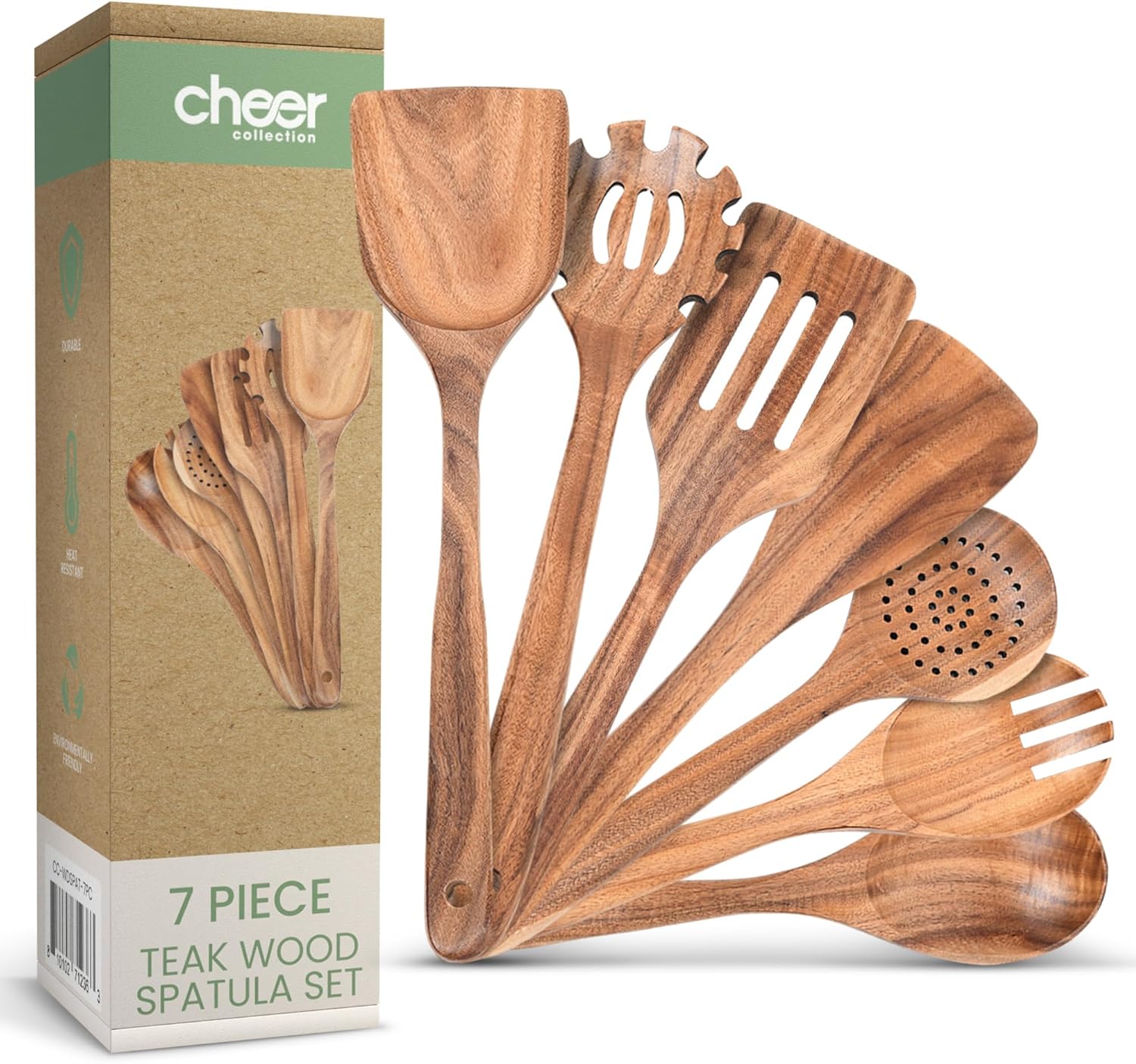 Cheer Collection Wooden Utensil Set - 7 Piece Cooking Utensils, Teak Wooden Spoons & Spatulas for Cooking, Heat Resistant, Non-Stick, and Safe Wooden Cooking Utensils