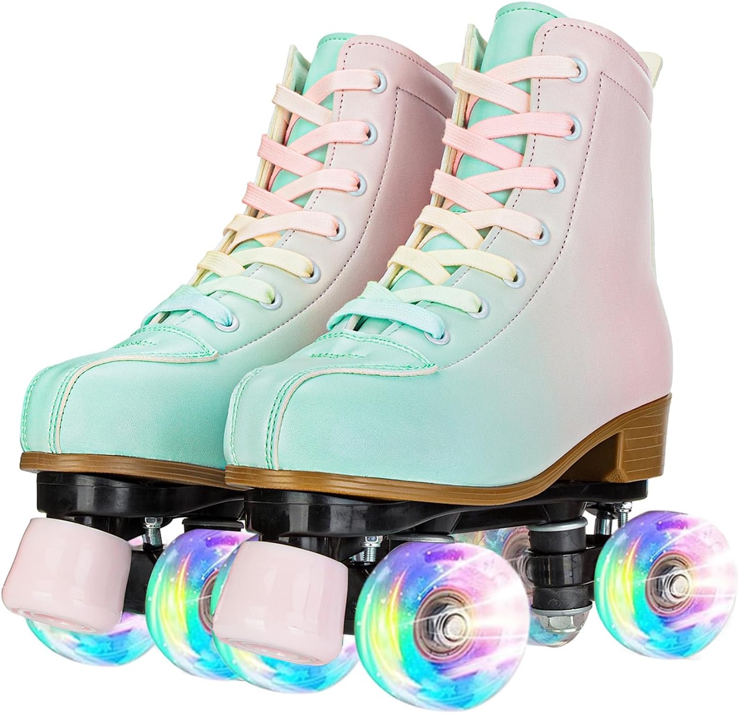 Cute Quad Roller Skates: Double-row, light up 4 wheels always shiny when skating without batteries. Unique illuminating colorful lights is more interesting and attractive. Gradient color is lovely and cute, perfect for girls and women. Lace-up style allows you to adjust the shoes to fit your foot better.