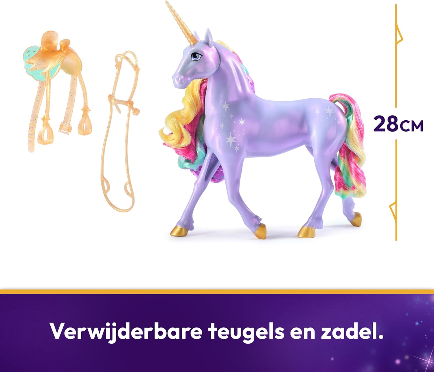 Contents: 1 unicorn, 1 detachable saddle, 1 removable bridle, 1 quick start guide, 1 instruction manual