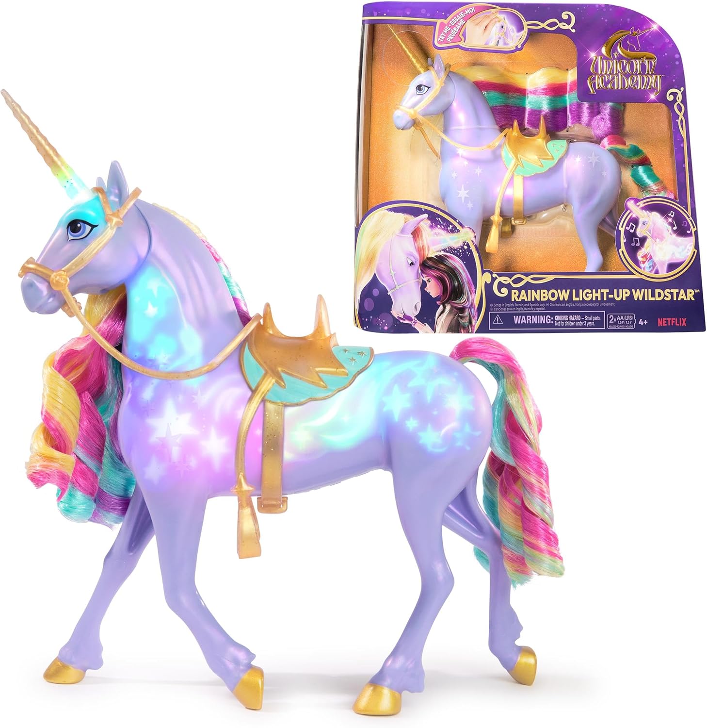 Discover your destination with Unicorn Academy Rainbow Wildstar. Inspired by the Netflix animated series and popular book series, this 28cm interactive unicorn responds to touch with rainbow lights, sound effects and songs from the series. With the light-up Light Magic Markers, Rainbow Moons, Rainbow Tail and much more, kids can recreate the magical bonding moment with Wildstar from the series. Rub Wildstar's face, touch her horn and pull her reins to see how she reacts. As your band gets stronger, Wildstar's white lights will be brighter. They turn into rainbow colors when you have gained her trust. Hold her face to complete the band and you'll hear Wildstar celebrate with the song of the series. After becoming pals with Wildstar, hold her face to play music again, touch her horn for guiding light and much more. Put Sophia (doll sold separately) on her back and go on an adventure. Expand your Unicorn Academy world with the fashion dolls and unicorns (each sold separately). For kids who enjoy unicorn and horse toys, dolls and accessories, playing with dollhouses, collectibles, plush toys and more, Unicorn Academy toys are a great gift for a birthday or other occasion. Requires 2 AA batteries and includes songs in English, French and Spanish. Experience the extraordinary with Rainbow Wildstar.