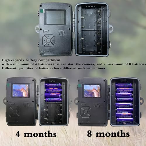 The length of the standby time is determined by the number of installed batteries. With a minimum of 4 batteries, the camera can be started and put on standby for up to 4 months. With 8 batteries, the standby time can be extended to 8 months, ensuring long-lasting performance. This means you can monitor the target area without having to change the batteries frequently within your required timeframe.