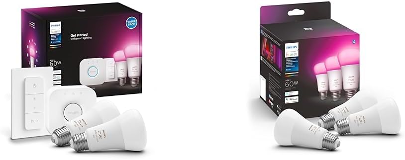 Philips Hue Smart Light Starter Kit - Includes (1) Bridge, (1) Dimmer Switch and (2) 60W A19 LED Bulb, White and Color Ambiance Color-Changing Light, 800LM, E26 - Control with App or Voice AssistantThis Philips Hue White and color ambiance E26 2-pack offers millions of shades of warm-to-cool white and color changing light to transform your home decor and the way you feel. These 60W equivalent smart RGB lights feature Bluetooth capability for instant light control in one room and offer up to 800 lumens of brightness. Bluetooth makes it easy to get started with Philips Hue. Simply screw in the bulbs, download the Hue app and start enjoying the convenience of smart lighting immediately. They can dim, brighten, and set the mood right out of the box. With Bluetooth you can control up to 10 lights in a single room. It's easy to have the right light for routines throughout the day with Hue light scenes. Or create the ultimate mood lighting with dynamic light effects that show subtle changes in color or brightness that you can customize in the app. Looking for smart bulbs that work with Alexa and Google Assistant? It's easy to set up voice control with the Hue app and use simple voice commands to control your lights. Whether you need smart LED lights for bedrooms, your living room, or even kids rooms, Hue complements your room decor while offering the convenience of smart control. Already have a Bridge or ready to get more from your Hue system? Connect them to a Hue Bridge (sold separately) to unlock the full power of Philips Hue, including the ability to control up to 50 lights and accessories, automations, and smart control from anywhere in the world.Philips Hue Smart 60W A19 LED Bulb - White and Color Ambiance Color-Changing Light - 3 Pack - 800LM - E26 - Indoor - Control with Hue App - Works with Alexa, Google Assistant and Apple HomekitNew to smart lighting? Get started with easy smart lighting with this Hue smart bulb. Just using Bluetooth, without the Hue Hub, you can control up to 10 lights in 1 room. Comfy on the couch? No need to get up to change your lights. Control your lights using the (free) Hue Bluetooth app or with just your voice with Alexa or Google Assistant. Works with all Echo smart speakers/displays and Google Nest devices, (Hue Hub required for Echo (1st Gen) and Echo Dot (1st Gen)). Certified for Humans: struggle-free, tinker-free, stress-free. No patience needed-they’re actually simple. Want to upgrade your whole home with smart lighting? Add a Hue Hub to control up to 50 light points, get access the full Hue capabilities (Home and away control, timers/routines, more smart home partners) and extended product portfolio (indoor/outdoor smart lighting and accessories). Already a Philips Hue customer? This bulb is also compatible with the Hue Hub. Philips Hue, the creator of Smart Lighting, brings you the most comprehensive, up-to-date and secure smart lighting ecosystem.