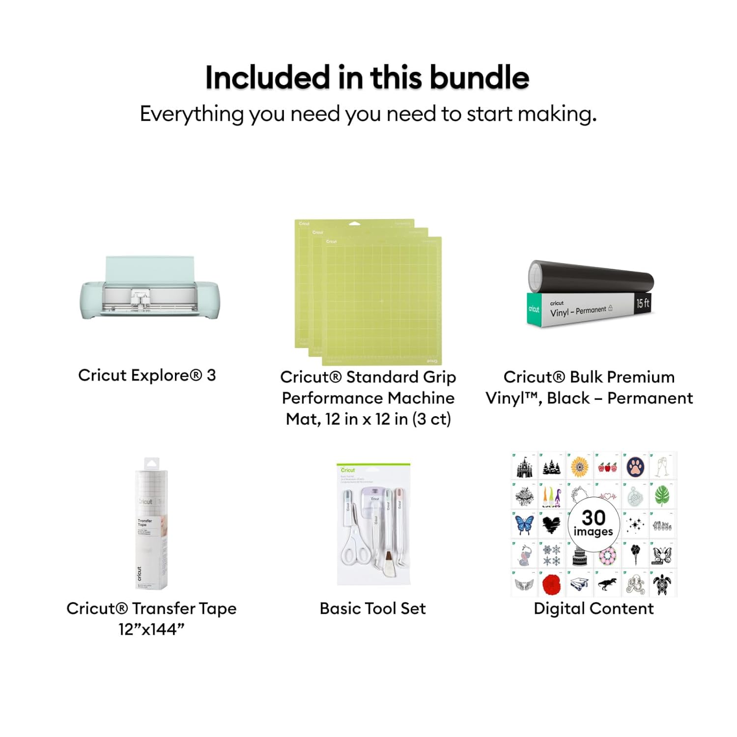 BUNDLE INCLUDES - Cricut Explore 3 Smart Cutting Machine, 30 images of digital content, Permanent Vinyl Roll (1ft x 15ft, Black), 1 roll of Transfer Tape (1ft x 12ft), 3 StandardGrip Machine Mats (12in x 12in), & 5-Piece Tool Kit