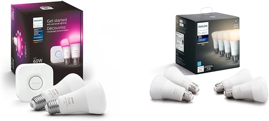 Product 1: WHAT’S IN THE BOX - Includes one Hue Bridge and two Hue white and color ambiance LED smart 60W A19 E26 base light bulbs suitable for most fixtures; Perfect for general lighting anywhere in your home​