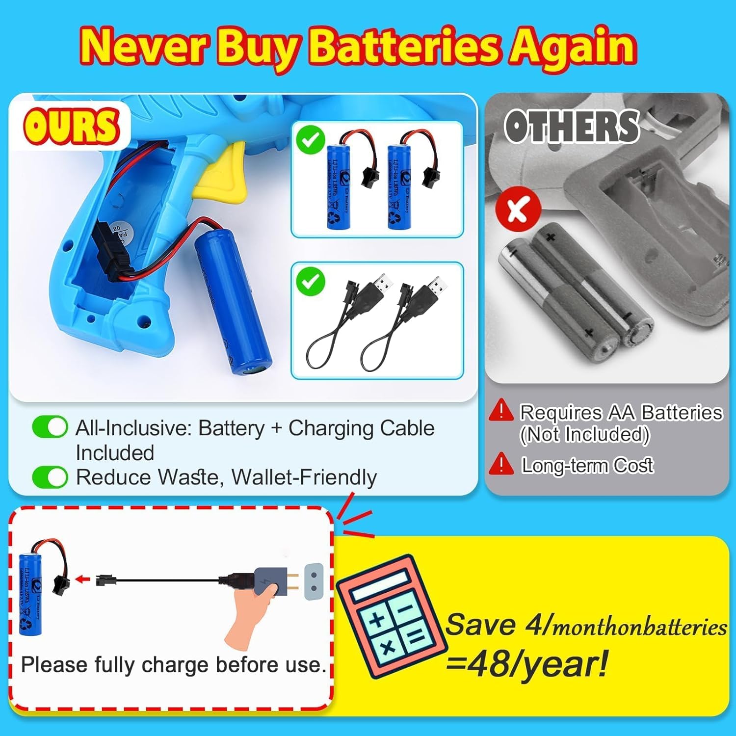 EASY TO USE: Our bubble guns for toddlers 1-3 includes everything you need. No need to buy and replace batteries frequently. The rechargeable battery and cable ensure uninterrupted bubble fun. Just charge the battery before use, connect it with the cable, with a simple press of the trigger, you can unleash a stream of delightful bubbles. Kids favorite Outdoor toys!