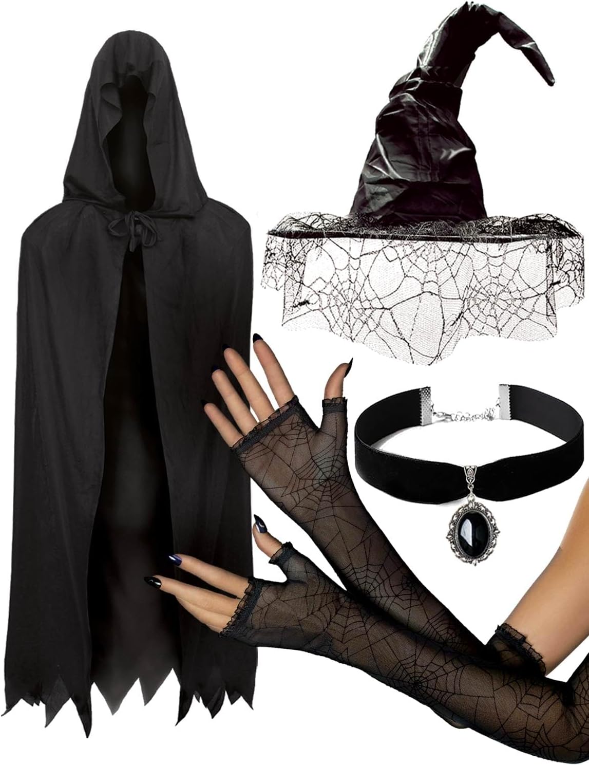 OLYPHAN Witch Costume for Women Halloween with Witch Hat Black Hooded Cloak Cape Spider Lace Gloves and Antique Like Pendant Choker Black Witch 4PC Accessories Set