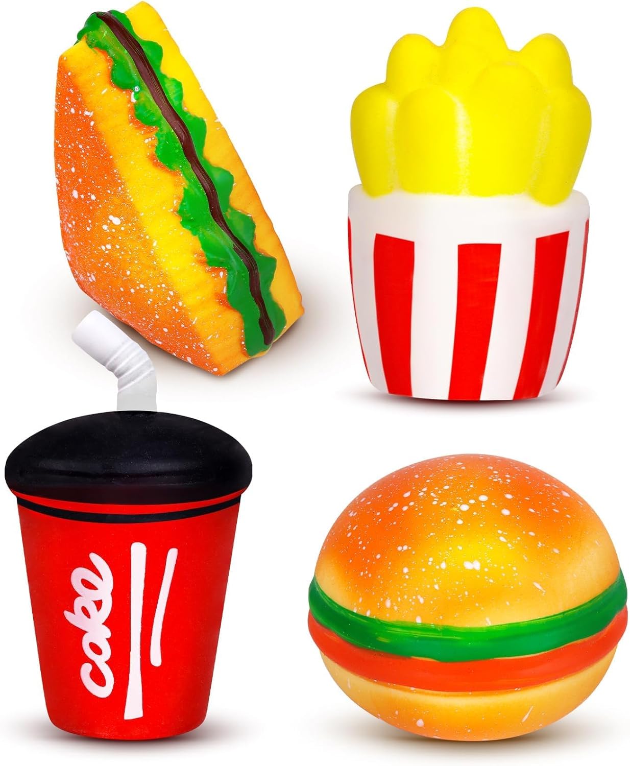 Anboor 4 Pack Food Squishies Toy, Simulation Sandwiches, Fries, Burgers, Cola Sensory Stress Relief Squeeze Toy for Kid and Adults Birthday Collection