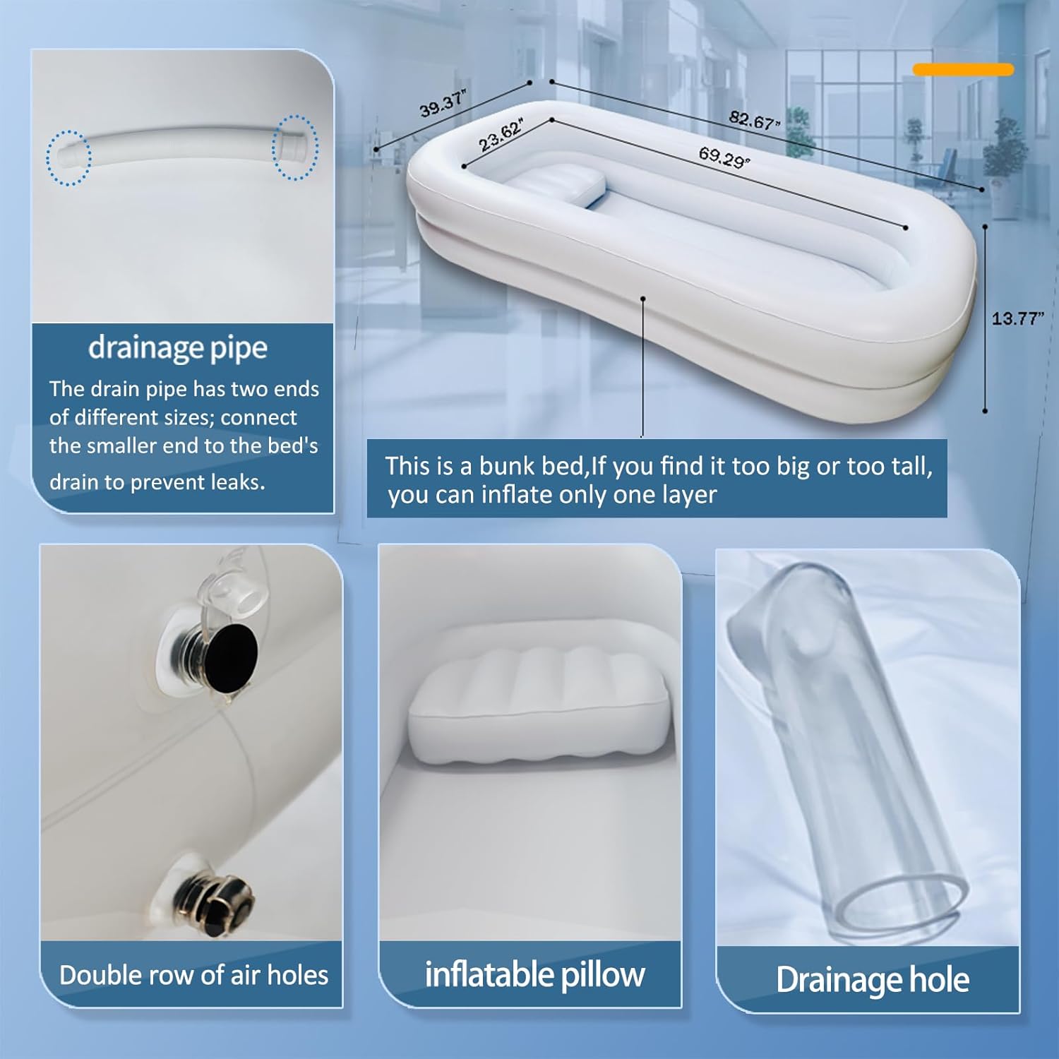 Instructions for use:When using a shower tub set, place the bed in place to inflate before lifting the individual onto the medical inflatable tub for comfort and safety. When inflating, don't overfill it to avoid it being too hard and uncomfortable to lie on. When showering in a medical inflatable bathtub, use warm water and mild detergent, and then clean it with clean water. Inflatable bathtubs for hospital beds are designed to provide individuals with a comfortable and convenient bed bath