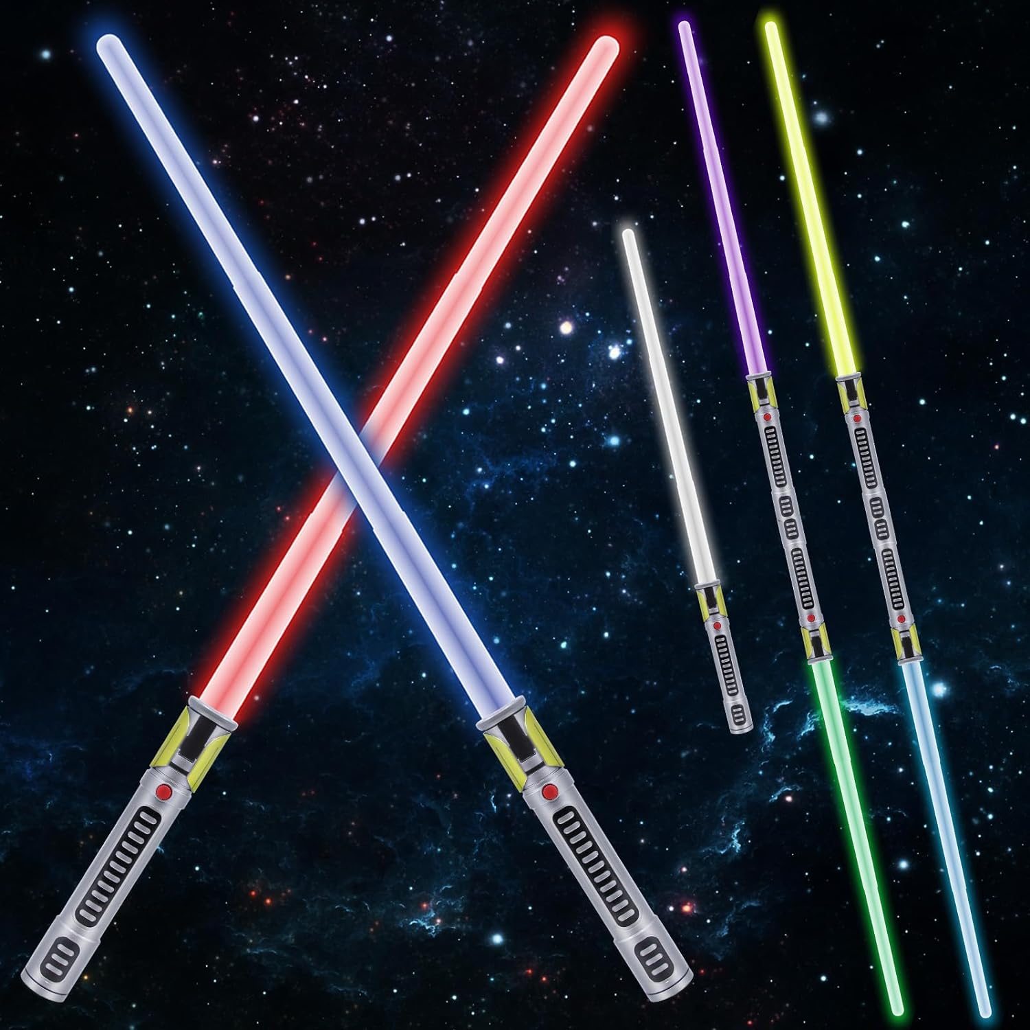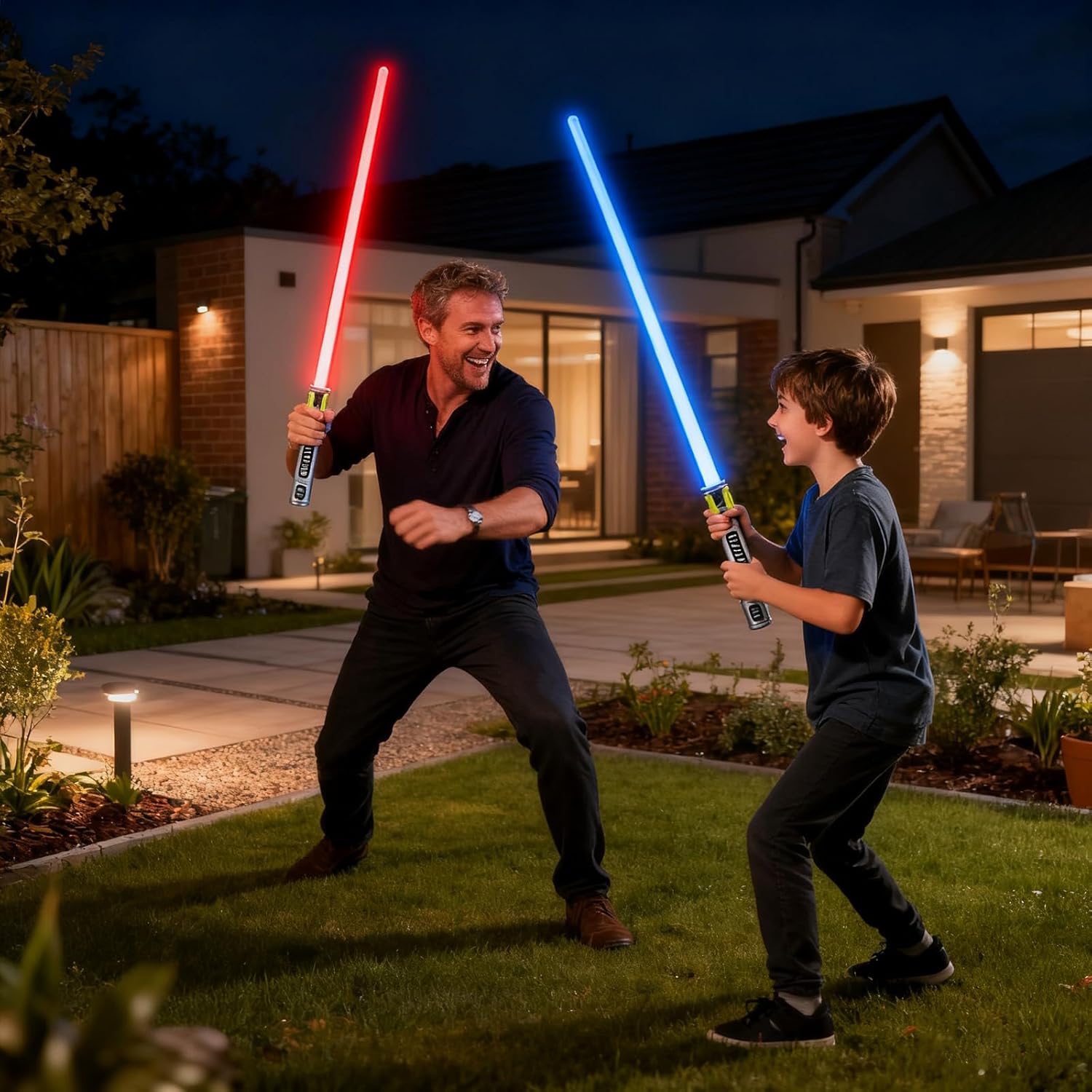 🌟【2-Pack for Group Fun + Stealth Missions】Includes 2 light-up swords for shared play, sleepovers, or birthday decorations. Each sword syncs with motion sensors for interactive dueling—and silent mode for stealthy galaxy warrior games(Batteries Included)