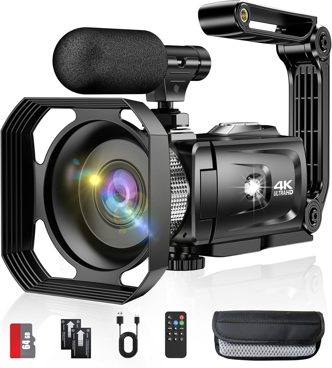 【Fácil de Usar】 La interfaz del operador de la cámara de video 4K es intuitiva y fácil de operar con una sola mano, conectar la computadora para transferir archivos también es fácil de operar. Además, es portátil y ligera, adecuada para guardar en el bolsillo. Además, también te equipamos con una tarjeta de memoria de 64G, por lo que la cámara está lista para tus necesidades de grabación.