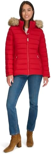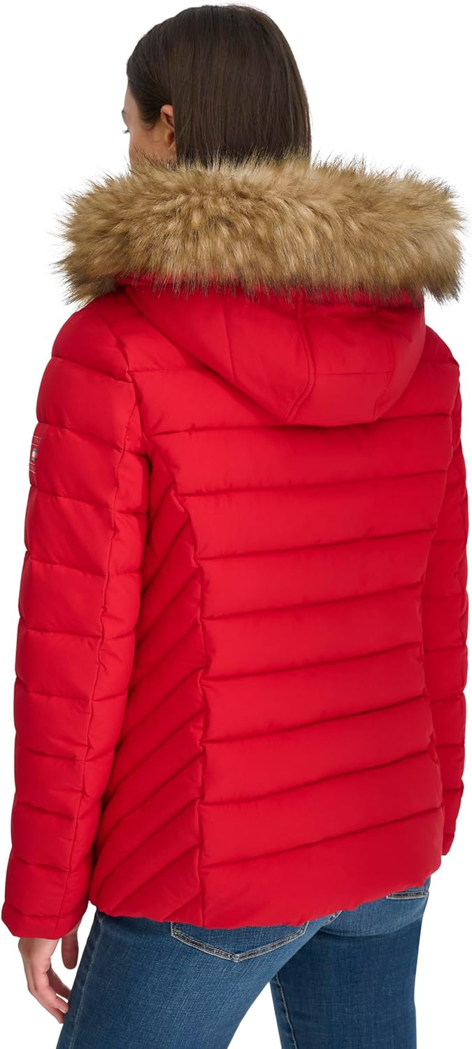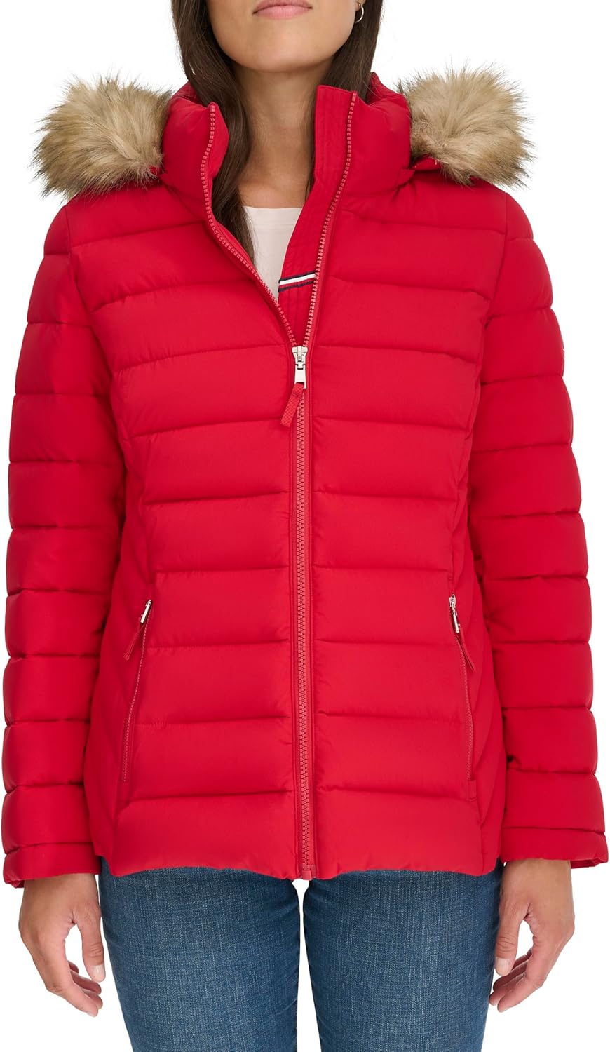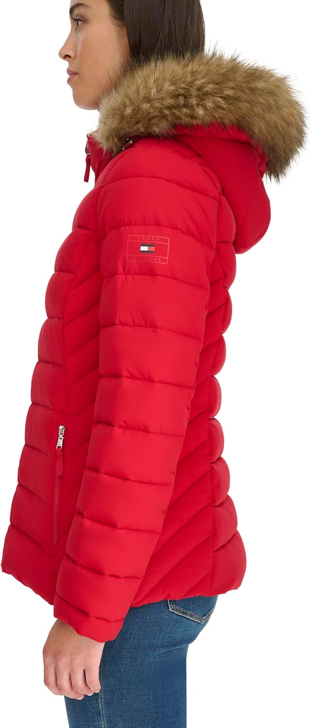 Experience the best comfort and coziness wearing the Tommy Hilfiger Faux Fur Trimmed Short Puffer Jacket. The puffer jacket comes with water-resistant channel quilting, for superior comfort in wet weather conditions. It features a standing collar, an attached hood with removable faux fur trim, full-zip closure, long sleeves, and two zippered pockets on the front. The polyester-lined puffer coat offers a classic fit and is perfect for cold & chilly weather. Standard length. 100% polyester. Machine washable.