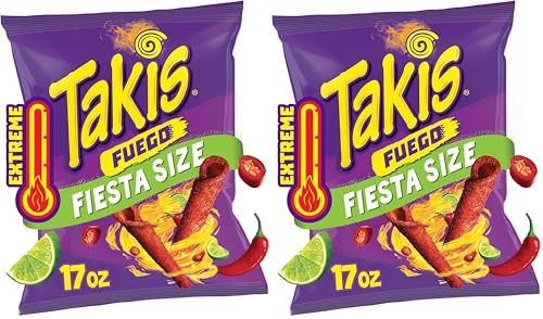 Takis Fuego 17 oz Fiesta Size Bag, Hot Chili Pepper & Lime Flavored Extreme Spicy Rolled Tortilla Chips (Pack of 2)