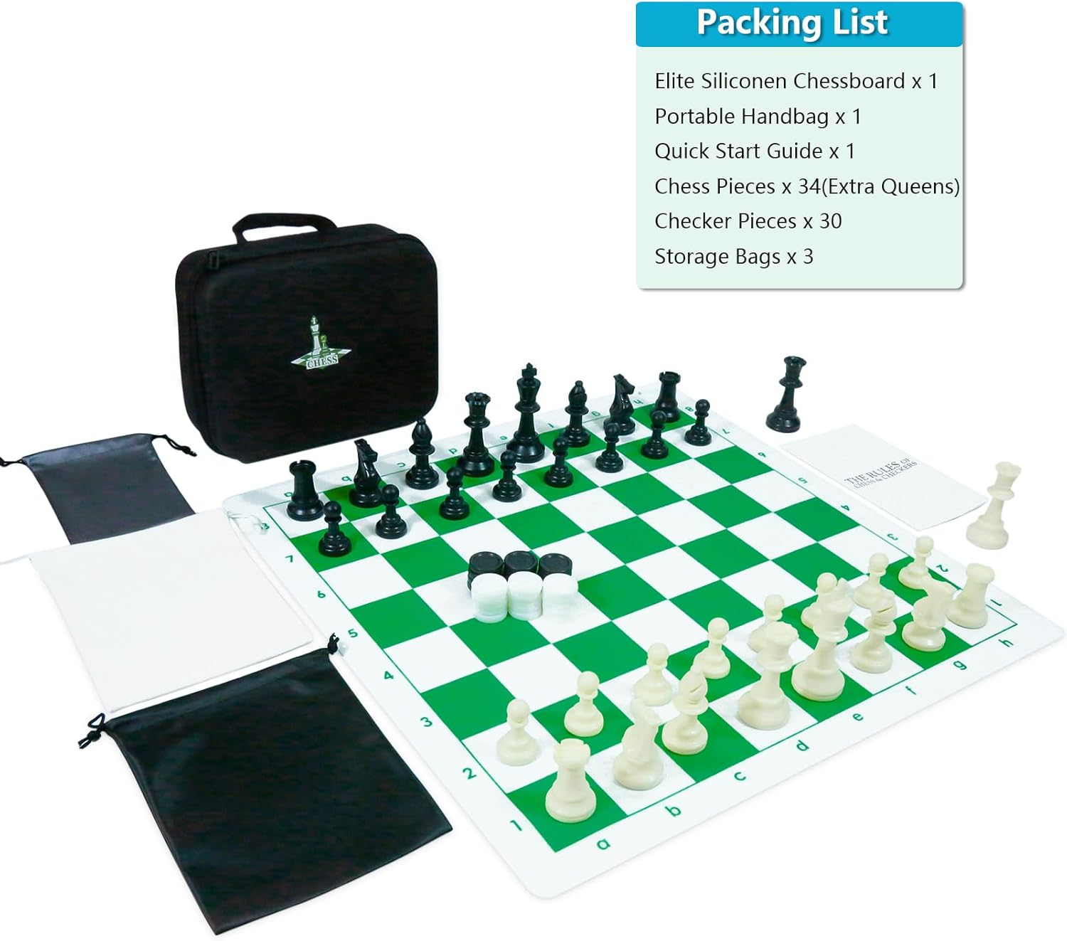 Perfect for Travel or Home: This tournament-sized chess and checkers set includes a 20" x 20" silicone board, Staunton-style pieces, 24 checker pieces, 3 drawstring bags, and a zippered travel case, making it easy to take with you wherever you go.