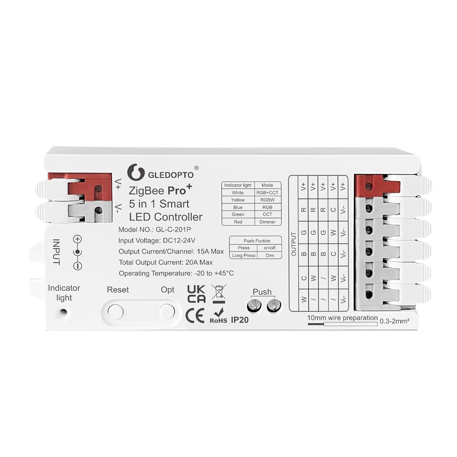 GLEDOPTO ZigBee3.0 Pro+ 5 in 1 LED Controller 20A Max RGBCCT/RGBW/RGB/CCT/Dimmer Compatible with Alexa Homey Home Assistant APP Control for RGBCCT RGB WWCW LED Strip Light (Hub Required)