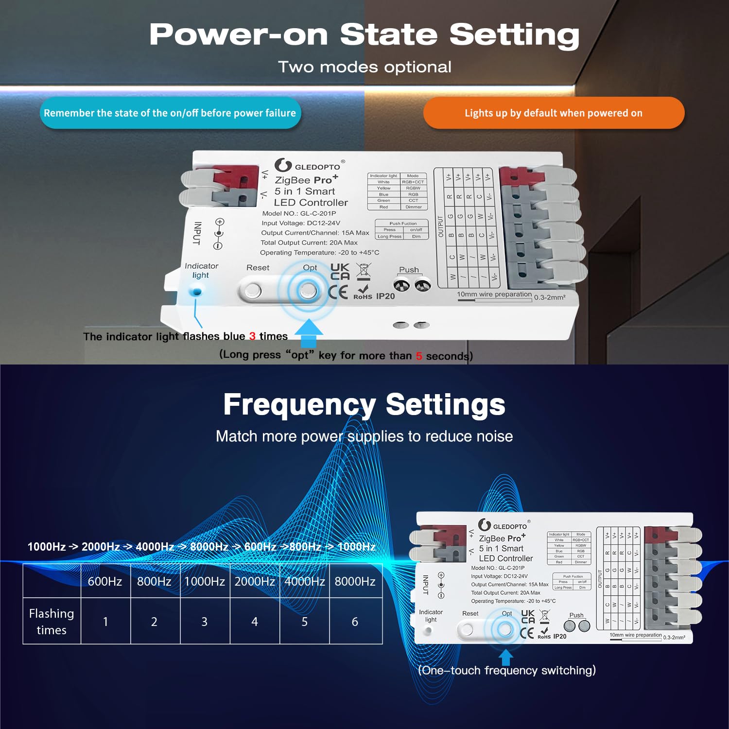 Power-on Status Settings: Long press "opt" button for more than 5 seconds, the indicator will flash in light blue color and resume to previous color after "off" for 4 seconds to complete power-on status setting
