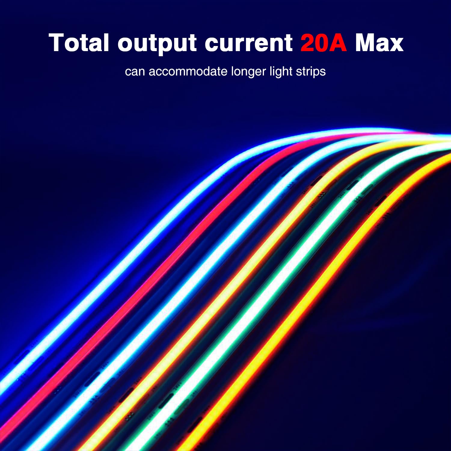 Total output current 20A Max: The maximum total current is 20A, and the maximum single channel current is 15A. It can connect longer strip lights, such as 15-20 meters
