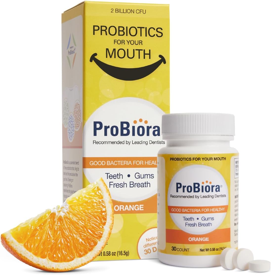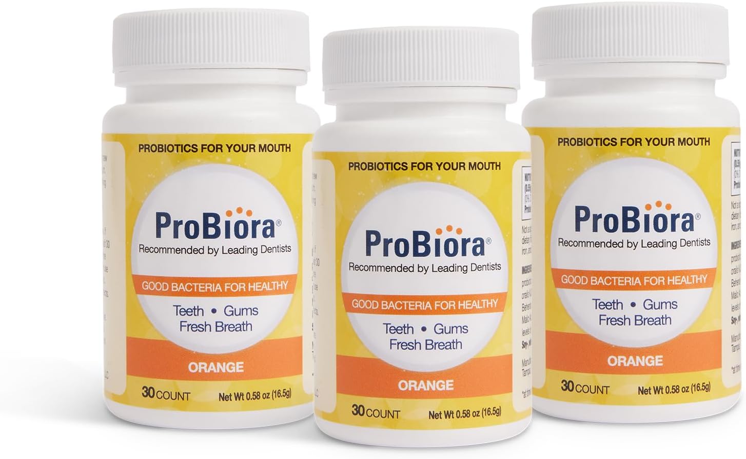 ProBiora is the first probiotic specifically designed for adults’ oral health. The original, dentist-recommended probiotics for the mouth, ProBiora uses 100% natural ingredients to repopulate the mouth’s good bacteria and crowd out the bad, disease-causing bacteria that causes bad breath, cavities, gum disease and more. The result? Fresher breath, whiter teeth, and better oral and overall health in as little as 30 days of daily use. Available in three, great-tasting flavors (orange, hint of mint, and extra minty), making ProBiora part of your daily oral-care routine is easy. Simply chew or dissolve one tablet a day at bedtime, right after brushing. Each tablet contains ProBiora3, a patented blend of good mouth probiotics that promotes gum and tooth health, fresher breath, and whiter teeth. Taken daily, ProBiora helps lower risk of cavities, periodontal disease, and gingivitis, keeping your teeth, and gums in great shape for years to come.