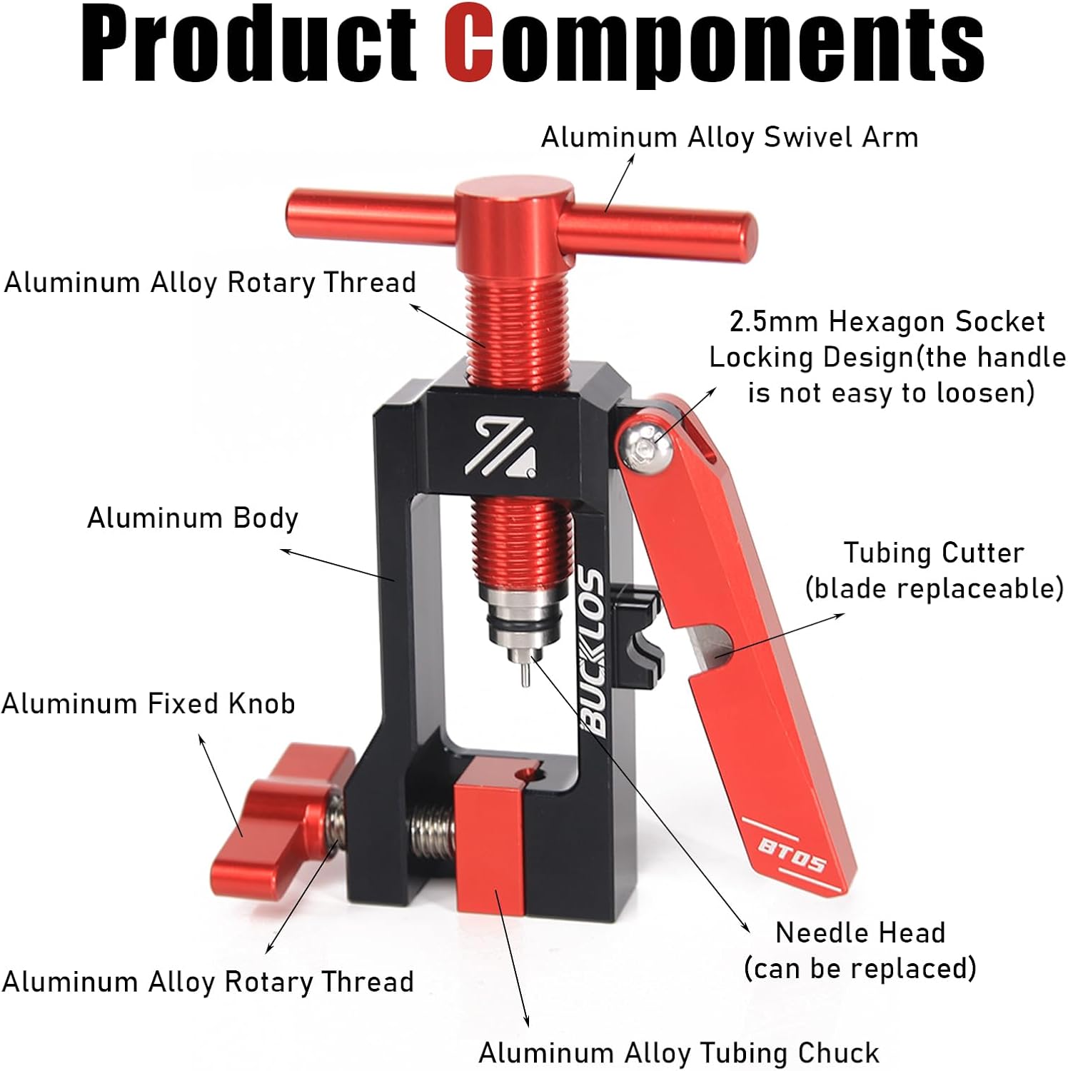Aluminum Alloy Material:BUCKLOS BT05 Bicycle oil needle insertion tool is made of Aluminum alloy with offers multi-specification compatibility and is suitable for various types of oil pipes and needles, providing a versatile user experience