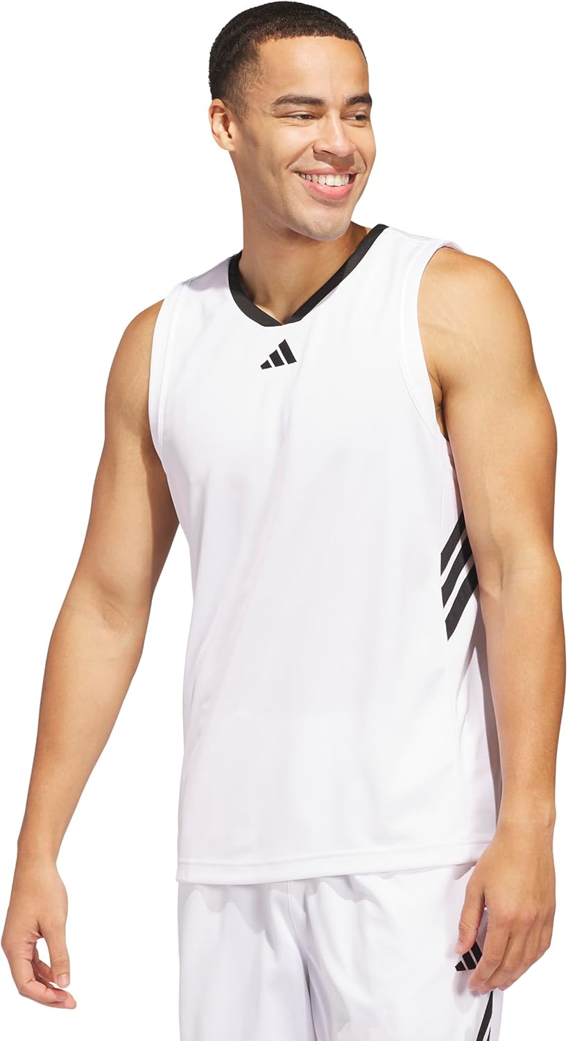 Comfortable and classic so you can dominate on the court. This men's adidas basketball jersey is made with wide armholes and a V-neck for a full range of motion on every jump shot. The 3 Bar Logo front and center and signature 3-Stripes on the sides sign off the look.