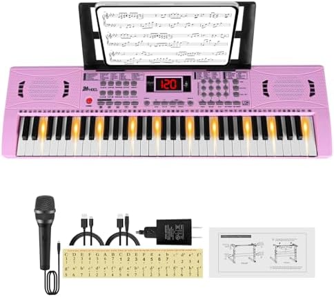 Kids Piano Keyboard, 61 Lighted Keys Electric Digital Keyboard Piano Kit 100 Voices, 100 Rhythms with Microphone, Gift for Children, Pink