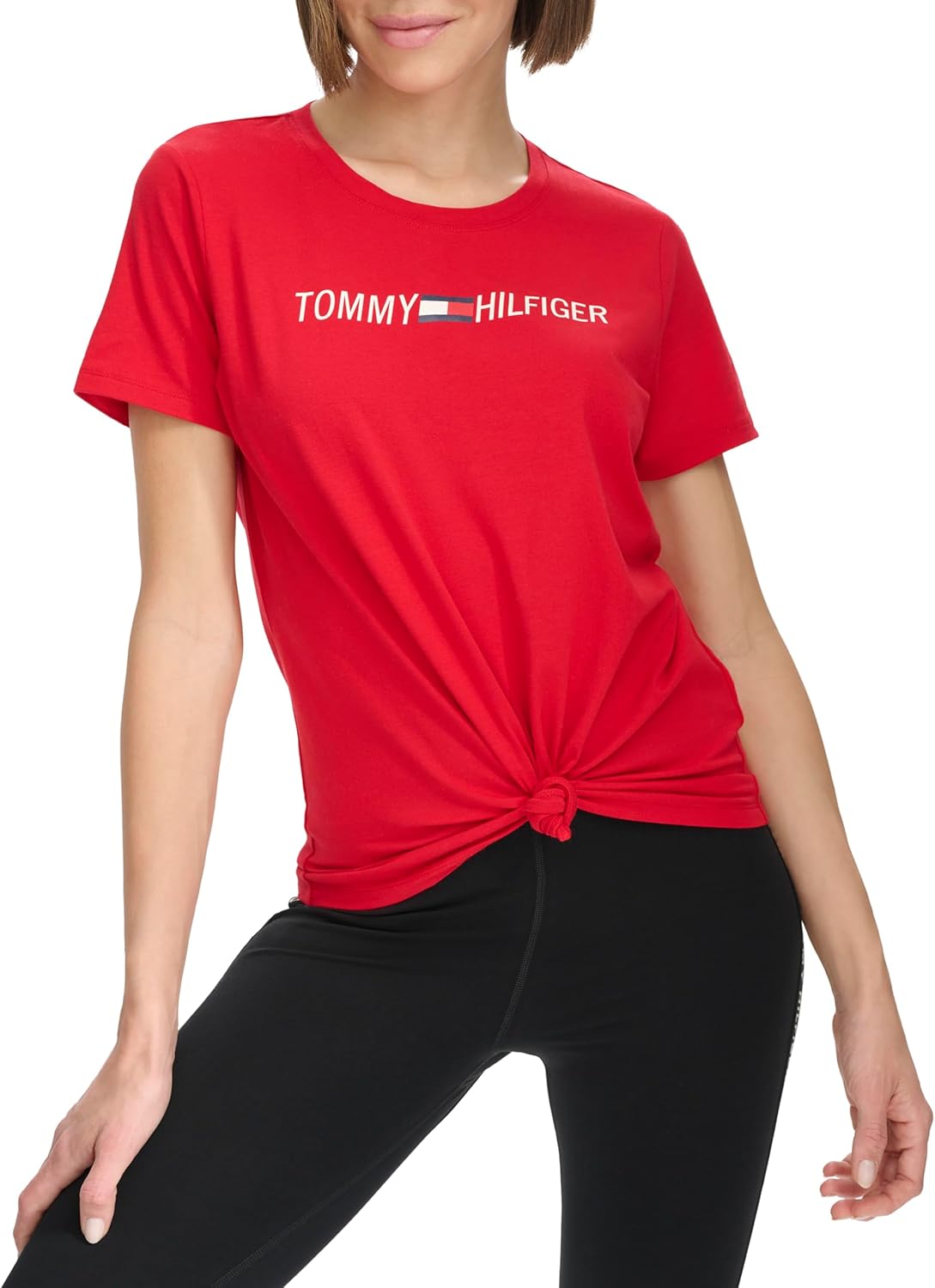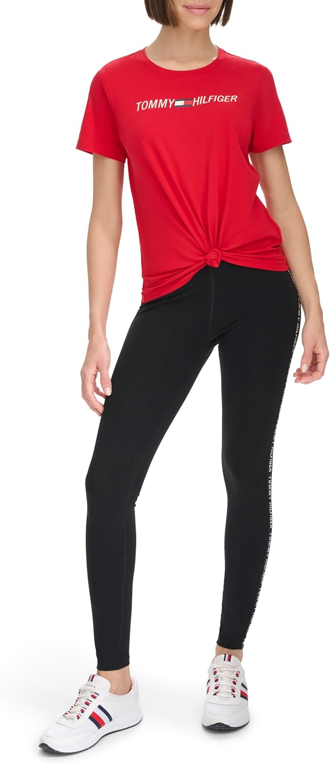 This Tommy Hilfiger Women's Performance T-shirt is a Lightweight, stretch cotton/modal blend, soft Knot detail Printed logo graphic Short sleeves, crew neck Everyday essential t-shirt