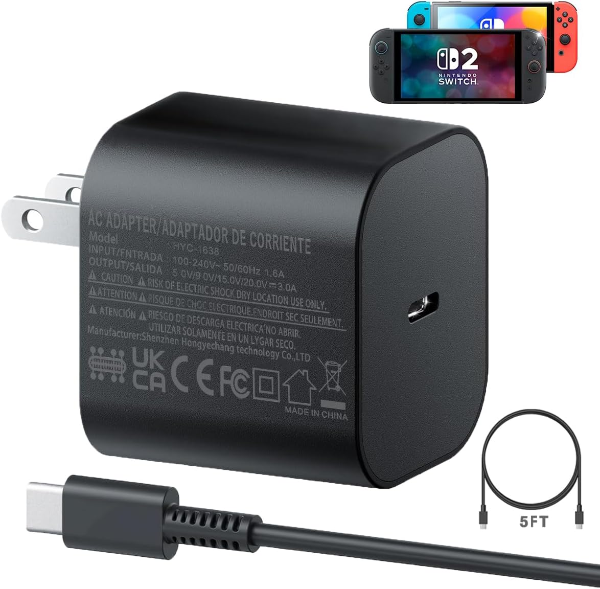 60W Charger for Nintendo Switch 2 - 60W ac power supply adapter for nintendo switch 2, usb type c charger compatible with nintendo switch/ switch lite/ switch oled/ switch pro controller/ ps5 controller and other type c devices. work as original charger support switch tv dock mode output 5V2A/ 15V2.6A/ 20V3A with 5ft usb c cable.