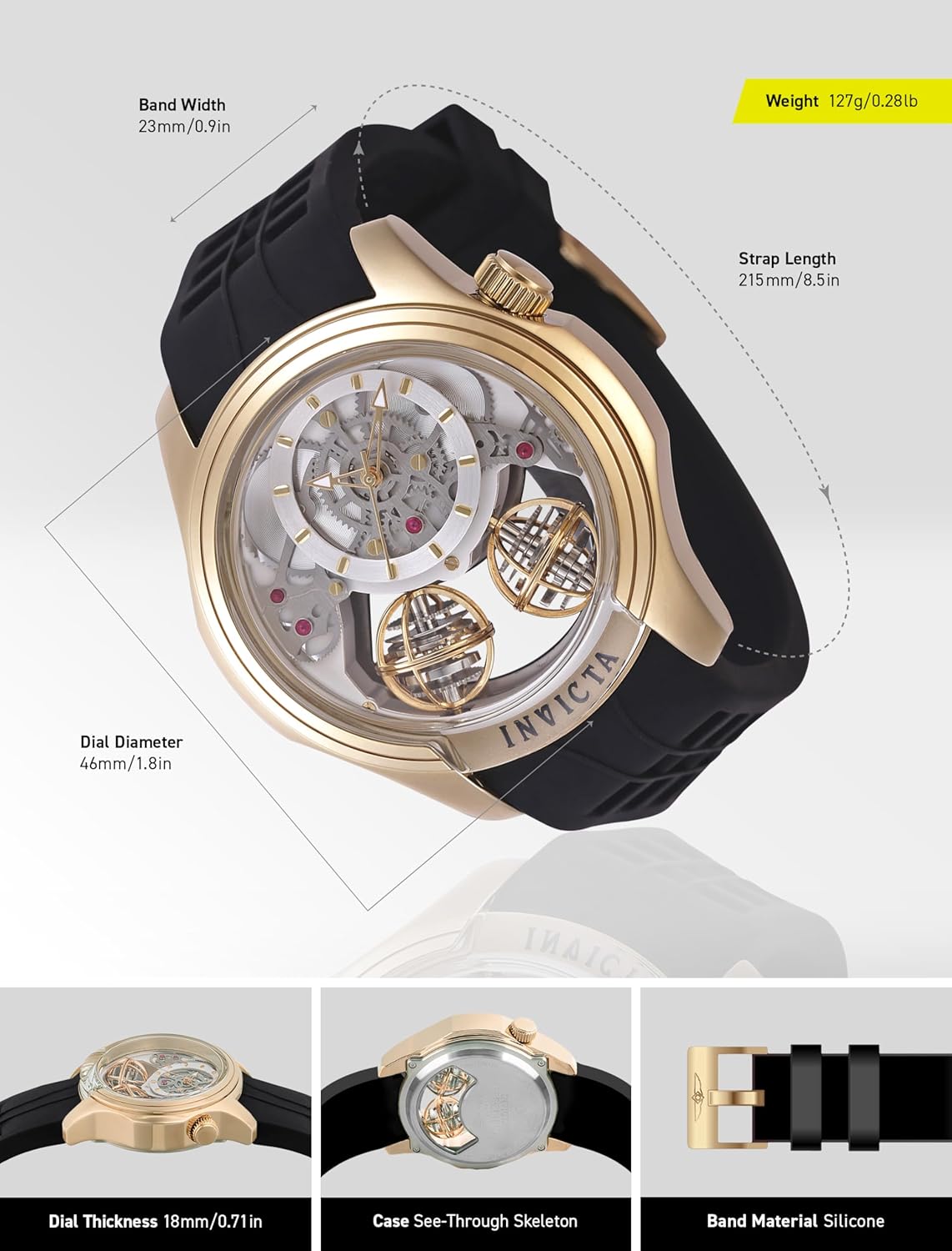 Silver-tone dial enhanced by gold-tone hands. Rose Gold-tone stainless steel case with a white silicone band. Quartz movement. 30 meters / 100 feet water resistance. Fixed bezel. Scratch Resistant Mineral crystal. Transparent See Through caseback. Buckle clasp. Pull / Push crown. Case size 46 mm x 18.00 mm. Band 23 mm x 8.50 incheslong. Invicta 47376 Specialty Watch.