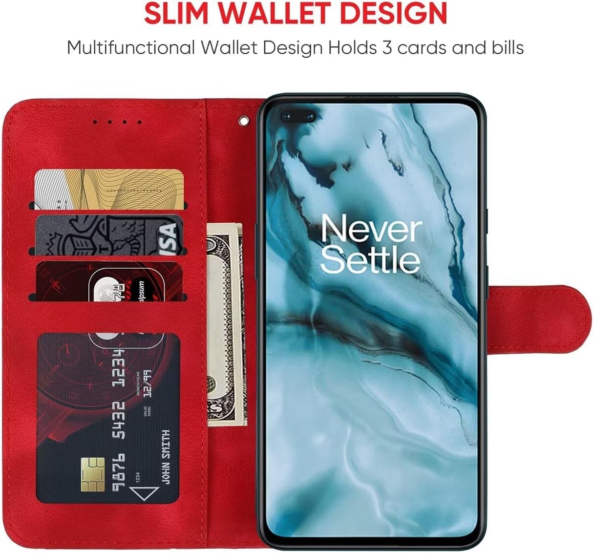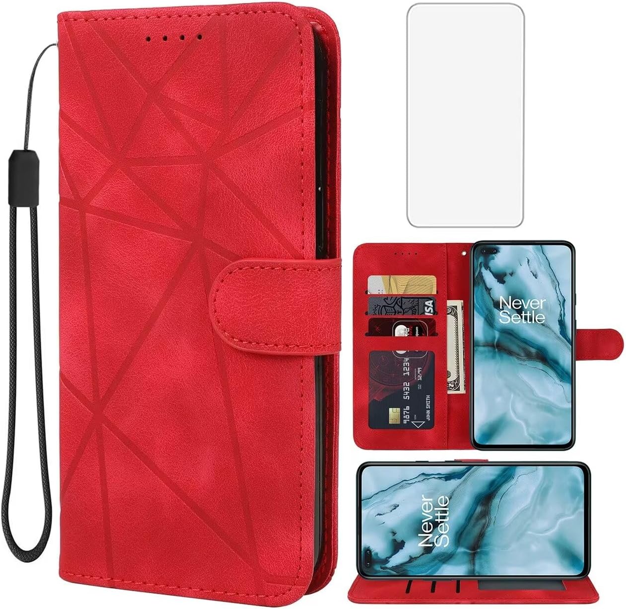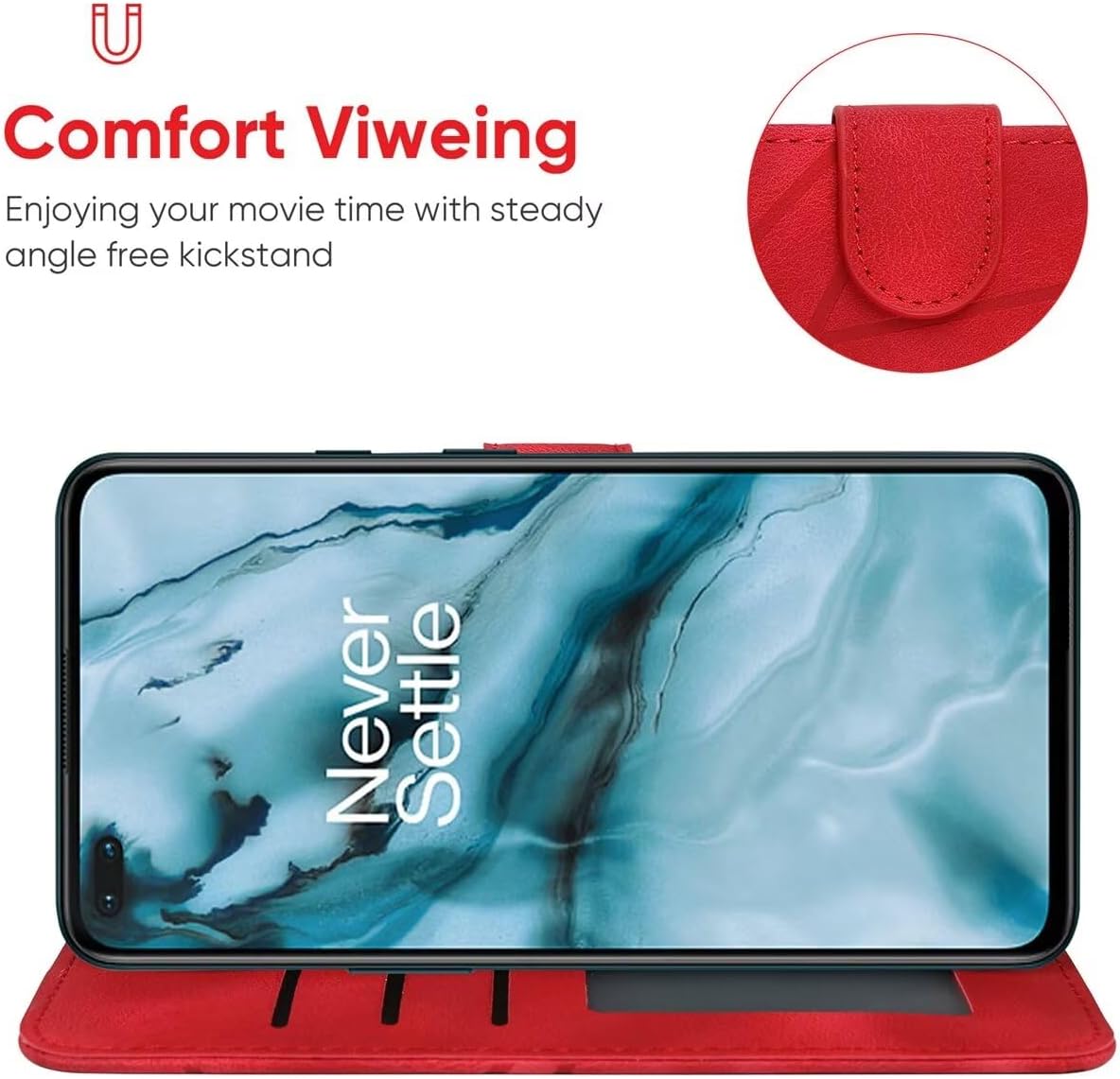 Case for Oneplus Nord Case,Oneplus Nord 5G AC2001 AC2003 Wallet Case with Tempered Glass Screen Protector, Skin Feel Leather Flip Credit Card Holder Stand Phone Cover for Oneplus Nord 5G Red